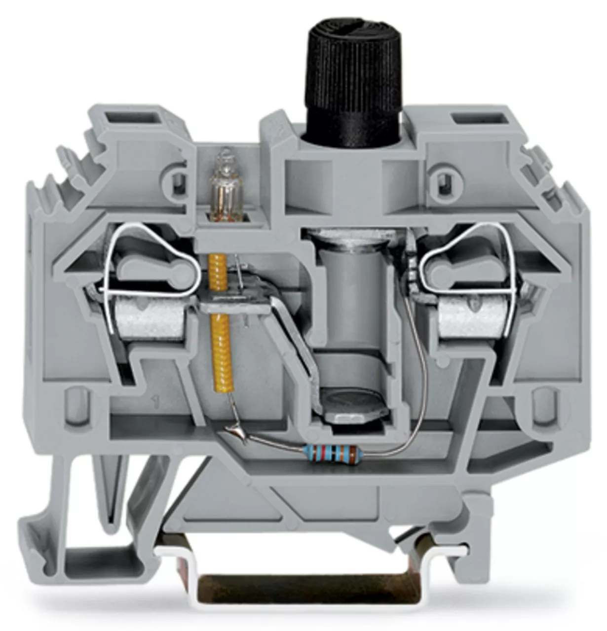 złączka bezpiecznikowa 2-przewodowa; do aparatowej wkładki bezpiecznikowej ¼" x 1¼"; z sygnalizacją przepalenia wkładki przez neonówkę; na szynę TS 35 x 15 i 35 x 7,5; 6 mm²; CAGE CLAMP®; szary