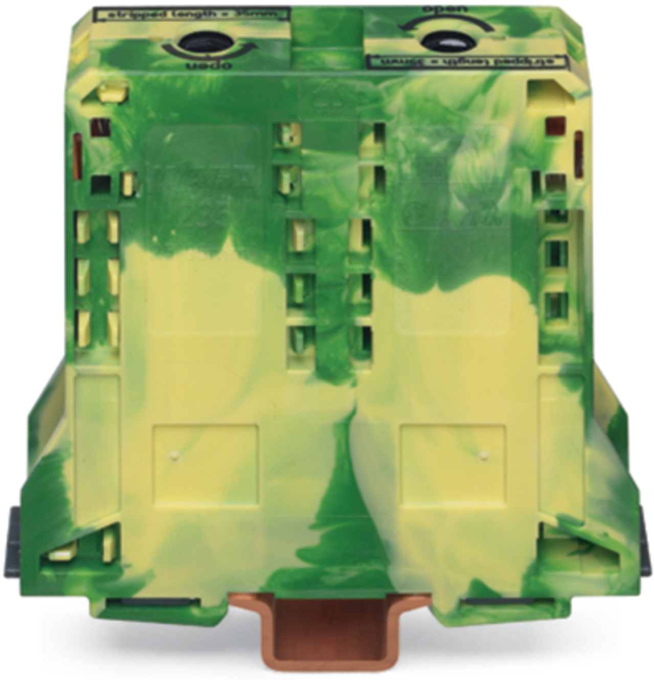 złączka PE 2-przewodowa; 95 mm²; do zastosowań Ex e II; boczne miejsca na oznaczniki; tylko na szynę TS 35 x 15; grubość 2,3 mm; miedź; POWER CAGE CLAMP; 95,00 mm²; żółto-zielony