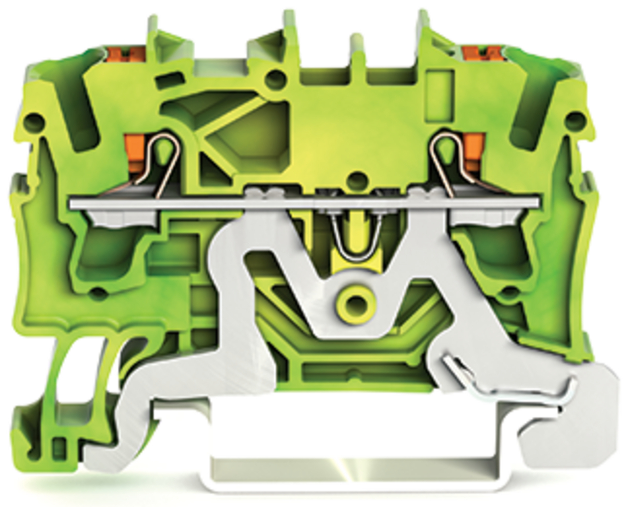 złączka PE 2-przewodowa; z przyciskami; 2,5 mm²; z otworem pomiarowym; opis z boku i na środku; na szynę TS 35 x 15 i 35 x 7,5; Push-in CAGE CLAMP®; 2,50 mm²; żółto-zielony