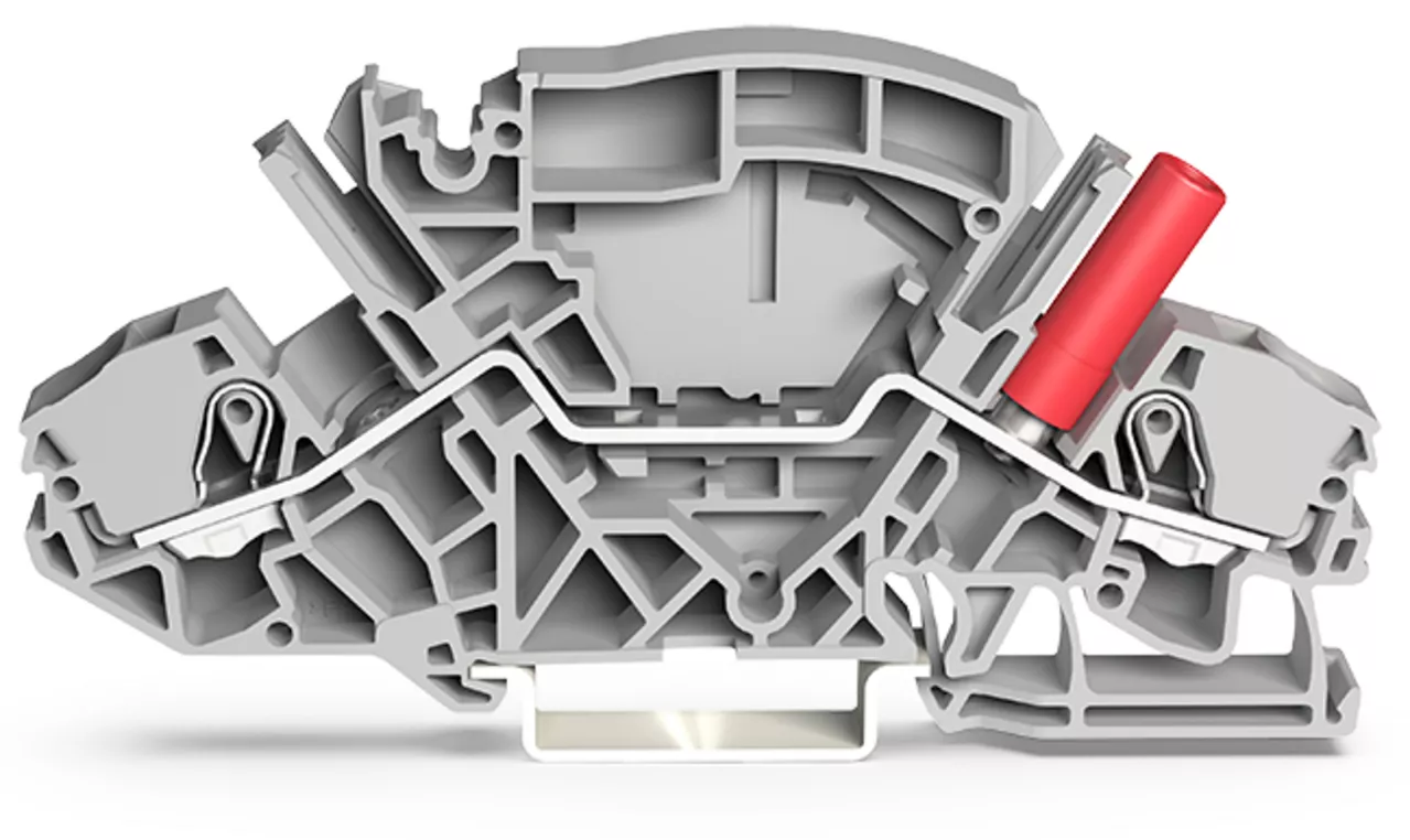 złączka przelotowa 2-przewodowa; 6 mm²; z izolowanym gniazdem pomiarowym; do wtyku pomiarowego Ø 4 mm; opis z boku i na środku; na szynę TS 35 x 15 i 35 x 7,5; Push-in CAGE CLAMP®; 6,00 mm²; szary