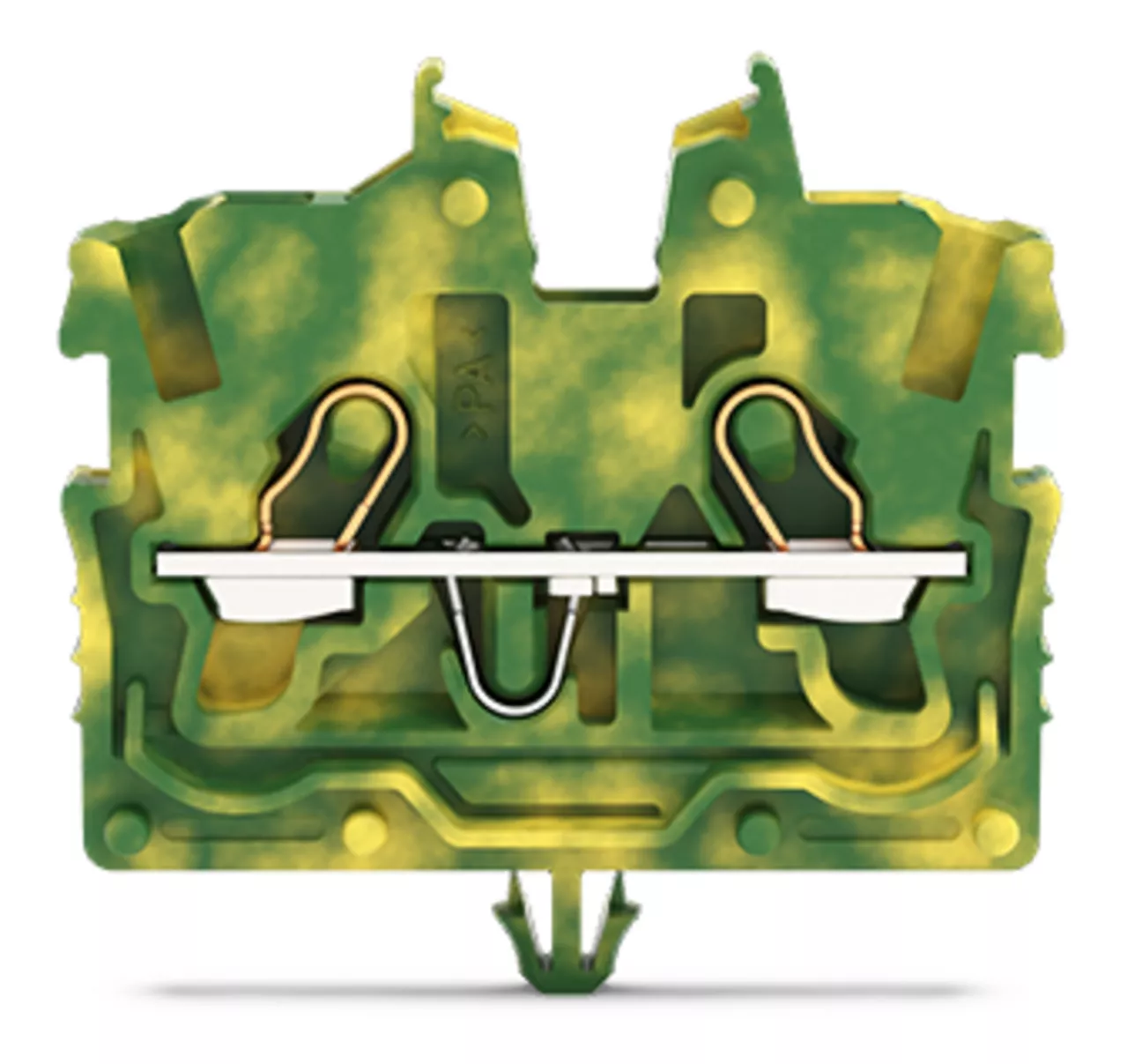 złączka przelotowa Mini 2-przewodowa; z otworem montażowym; 1 mm²; ze stopką zatrzaskową; opis z boku i na środku; z otworem pomiarowym; Push-in CAGE CLAMP®; 1,00 mm²; żółto-zielony