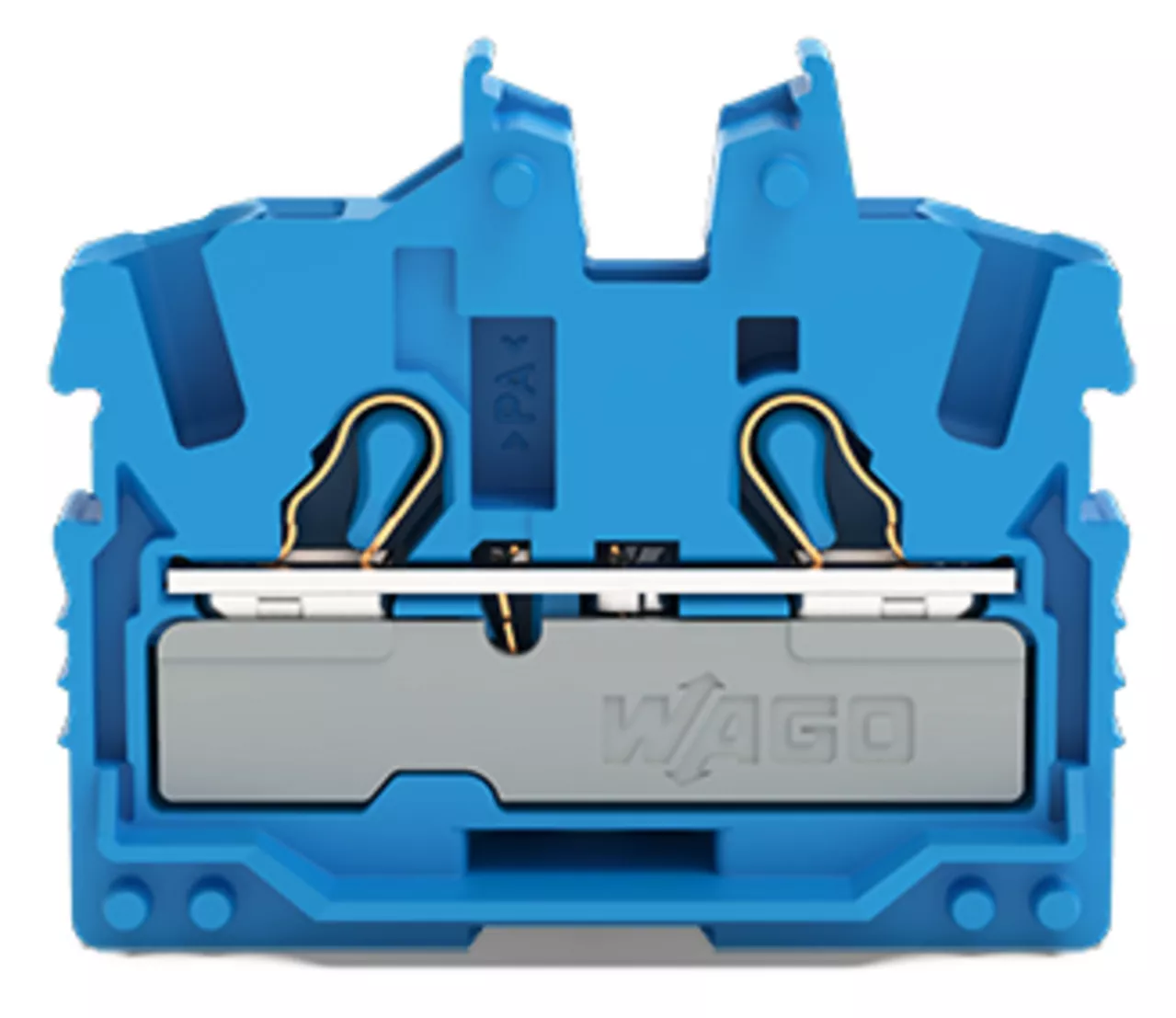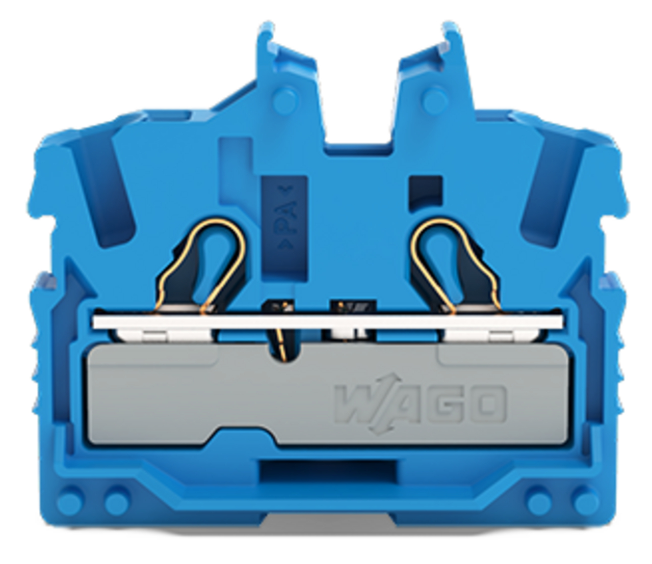 złączka przelotowa Mini 2-przewodowa; z otworem montażowym; 2,5 mm²; złączka końcowa z uchwytem montażowym; opis z boku i na środku; z otworem pomiarowym; Push-in CAGE CLAMP®; 2,50 mm²; niebieski