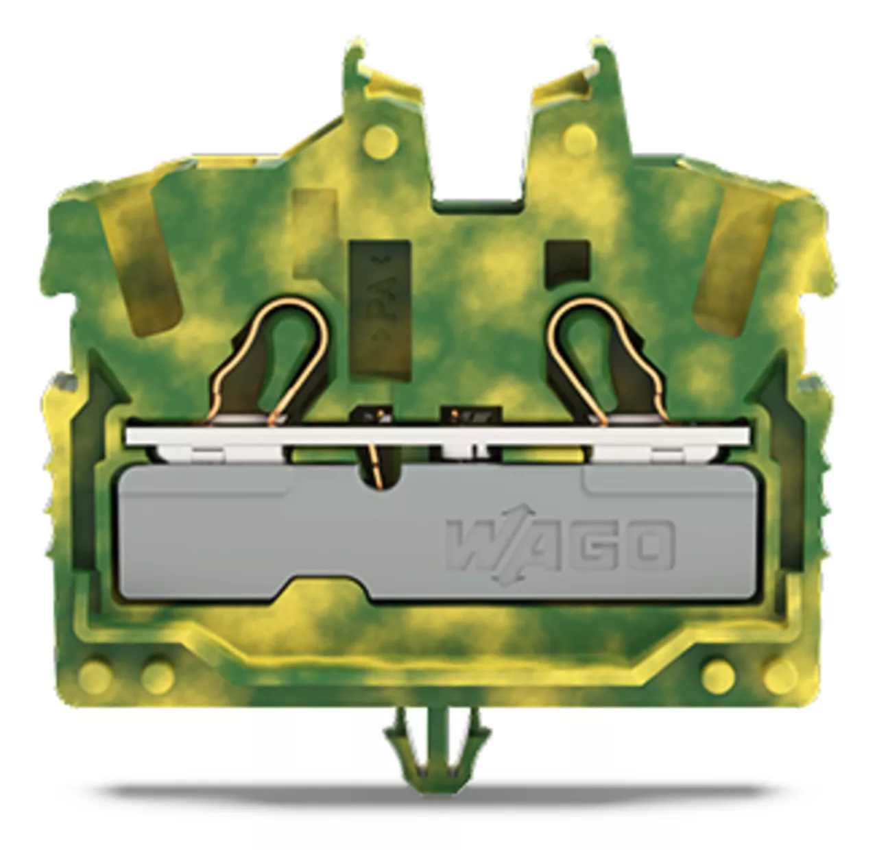 złączka przelotowa Mini 2-przewodowa; z otworem montażowym; 2,5 mm²; ze stopką zatrzaskową; opis z boku i na środku; z otworem pomiarowym; Push-in CAGE CLAMP®; 2,50 mm²; żółto-zielony