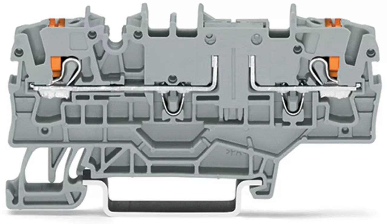 złączka przelotowa 2-przewodowa; z przyciskami; 2,5 mm²; z możliwością pomiaru; z dodatkowym mostkowaniem; o kształcie złączki rozłączalnej 2-przewodowej; opis z boku i na środku; na szynę TS 35 x 15 i 35 x 7,5; Push-in CAGE CLAMP®; 2,50 mm²; szary