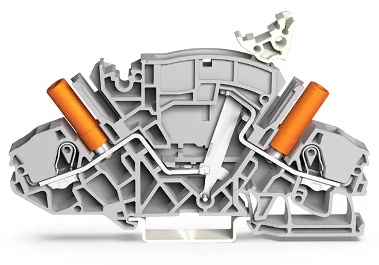 złączka rozłączalno-pomiarowa 2-przewodowa; np. do przekładników napięciowych; z izolowanymi gniazdami pomiarowymi; do wtyku pomiarowego Ø 4 mm; na szynę TS 35 x 15 i 35 x 7,5; 6 mm²; Push-in CAGE CLAMP®; 6,00 mm²; szary