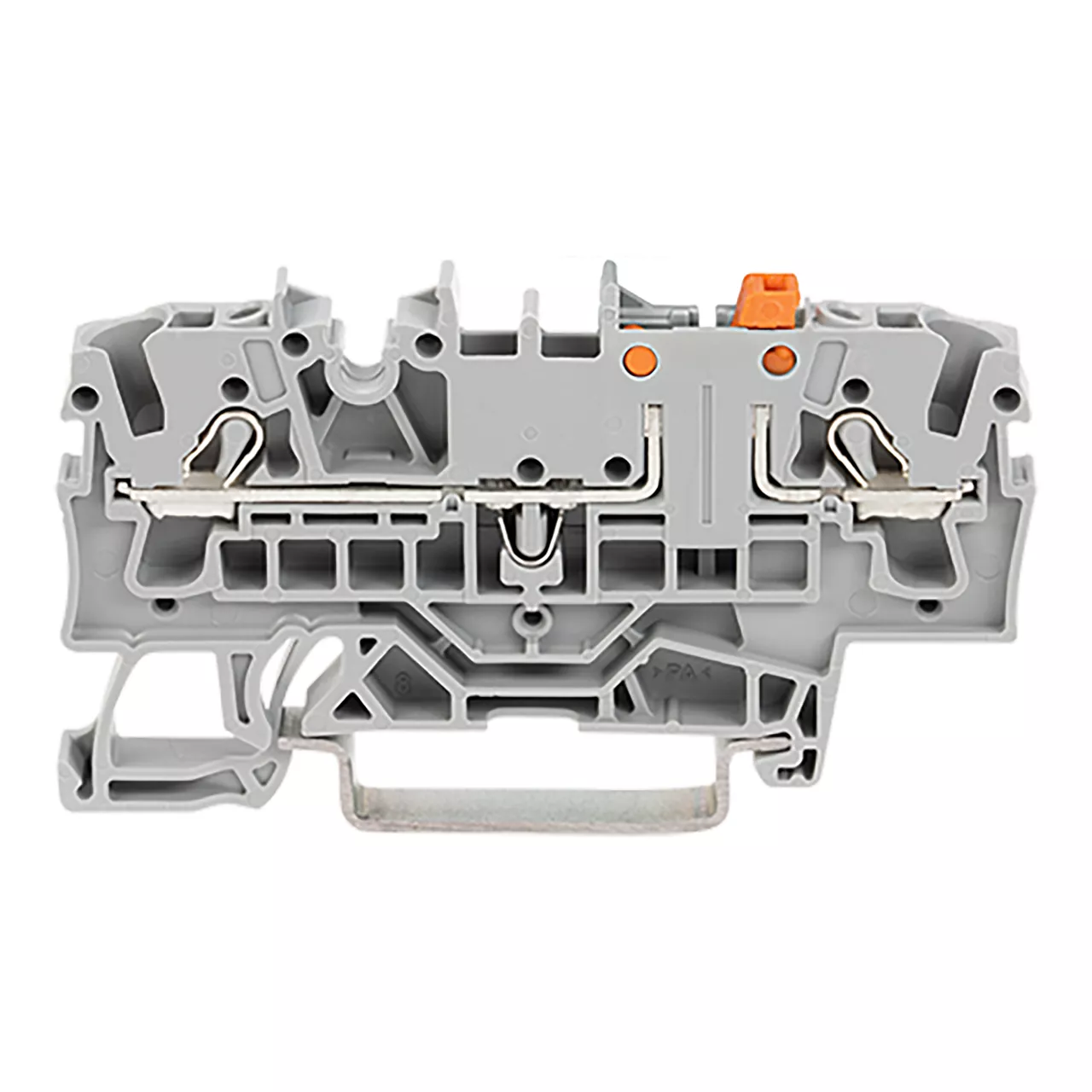 złączka rozłączalno-pomiarowa 2-przewodowa; z możliwością pomiaru; uchwyt łącznika nożowego pomarańczowy; na szynę TS 35 x 15 i 35 x 7,5; 2,5 mm²; Push-in CAGE CLAMP®; 2,50 mm²; szary