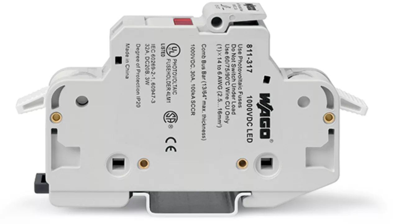 gniazdo bezpiecznikowe 2-przewodowe; do bezpieczników cylindrycznych 10 x 38 mm 13/32" x 11/2"; do fotowoltaiki; 1-bieg.; z sygnalizacją przepalenia wkładki; 1000 V DC; na szynę TS 35 x 15 i 35 x 7,5; 16 mm²; CAGE CLAMP®; jasnoszary