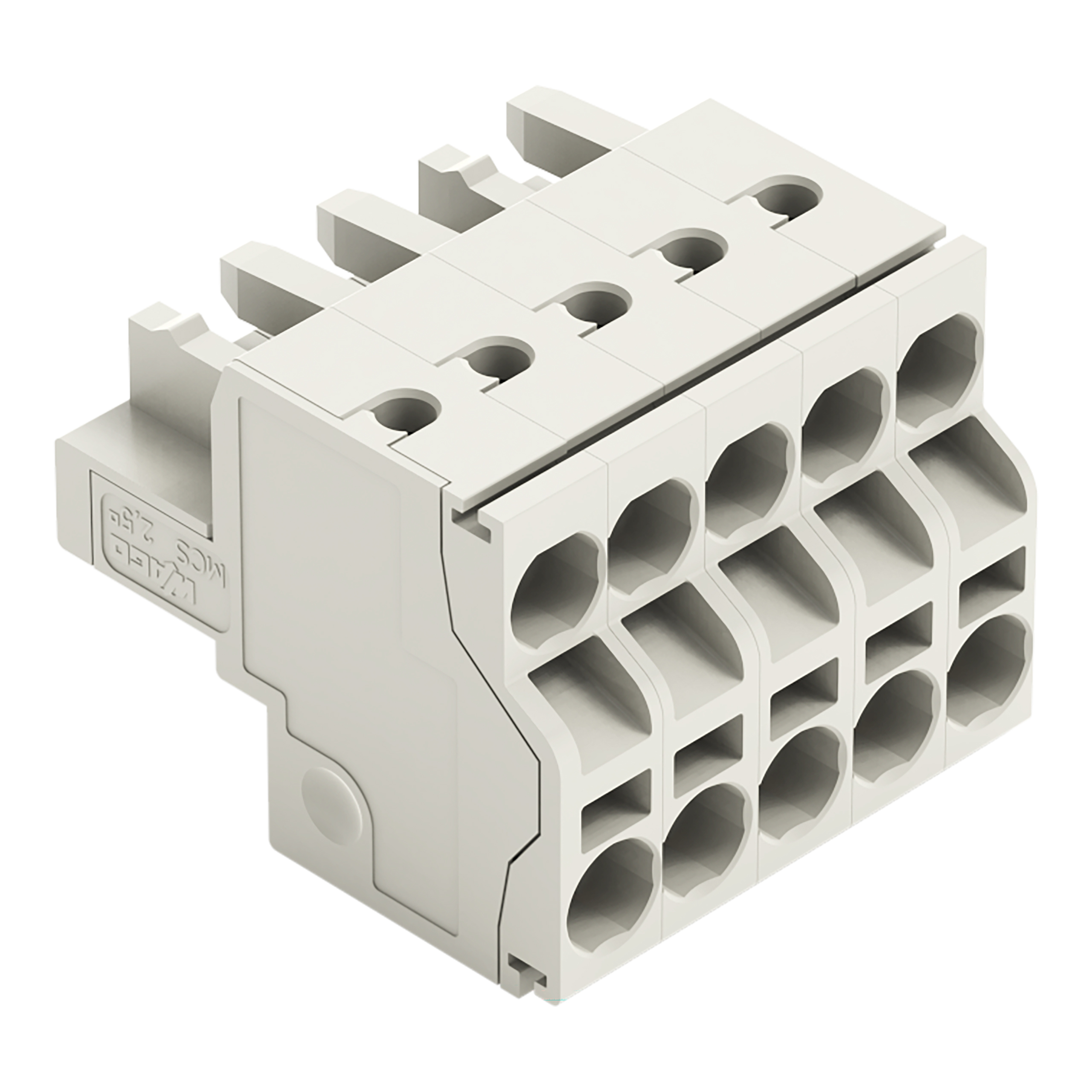 gniazdo 2-przewodowe; Push-in CAGE CLAMP®; 2,5 mm²; raster 5 mm; 5-bieg.; 100% ochrona przed błędnym połączeniem; ze zintegrowaną ścianką końcową; 2,50 mm²; jasnoszary