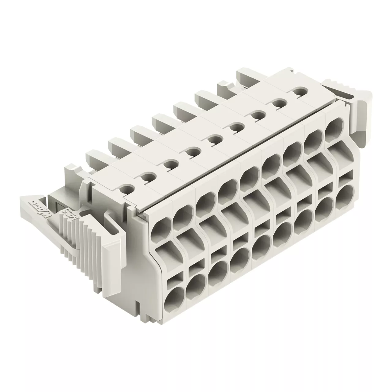 gniazdo 2-przewodowe; Push-in CAGE CLAMP®; 2,5 mm²; raster 5 mm; 9-bieg.; 100% ochrona przed błędnym połączeniem; boczne zaczepy ryglujące; 2,50 mm²; jasnoszary