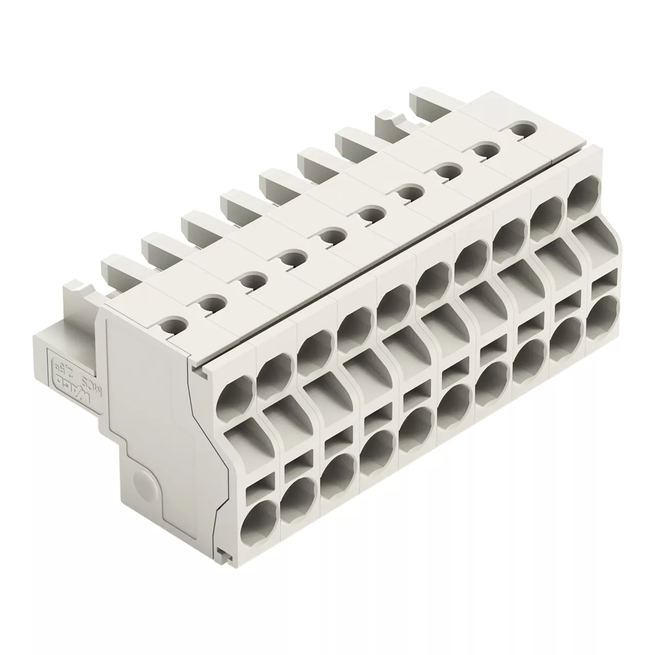 gniazdo 2-przewodowe; Push-in CAGE CLAMP®; 2,5 mm²; raster 5 mm; 10-bieg.; 100% ochrona przed błędnym połączeniem; ze zintegrowaną ścianką końcową; 2,50 mm²; jasnoszary