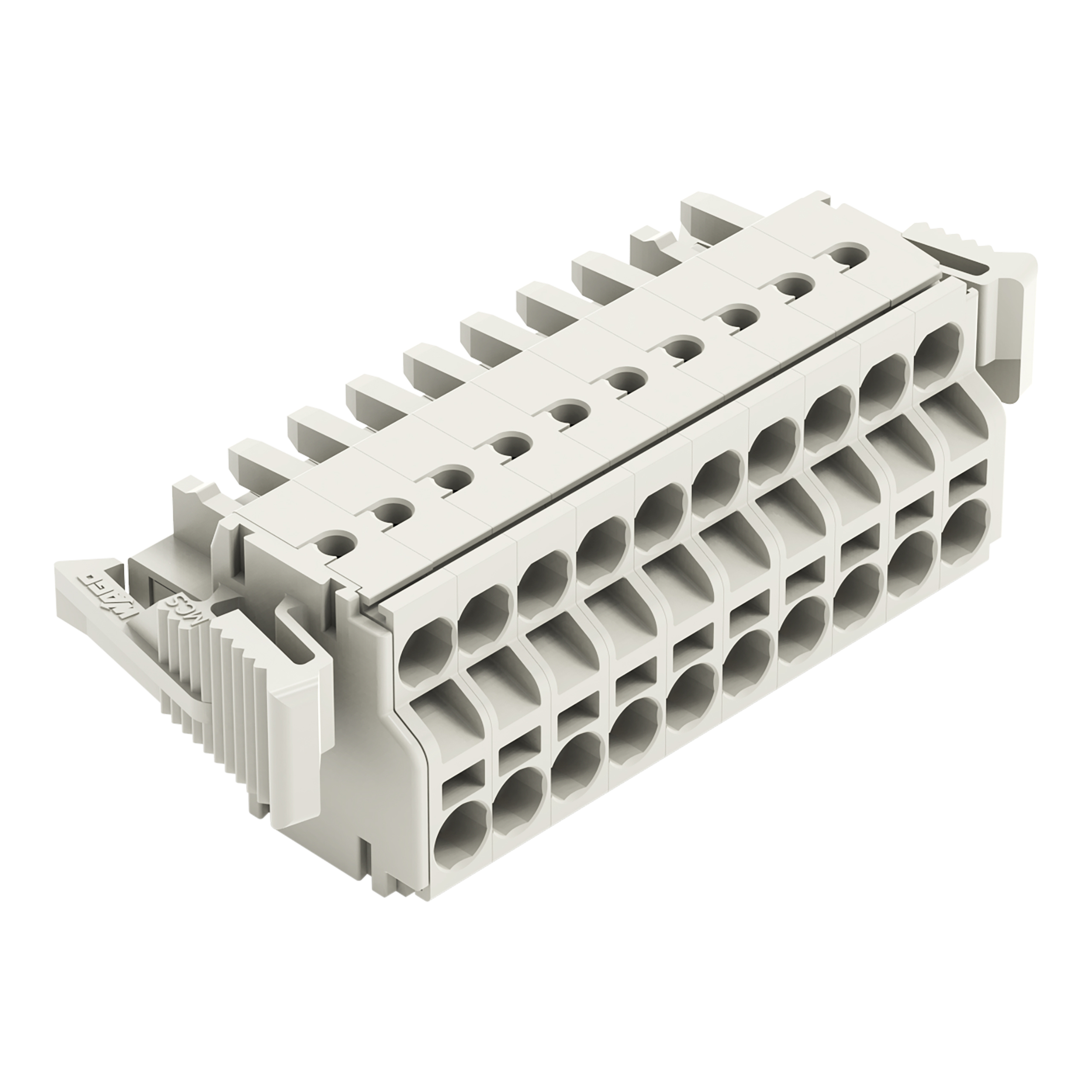 gniazdo 2-przewodowe; Push-in CAGE CLAMP®; 2,5 mm²; raster 5 mm; 10-bieg.; 100% ochrona przed błędnym połączeniem; boczne zaczepy ryglujące; 2,50 mm²; jasnoszary