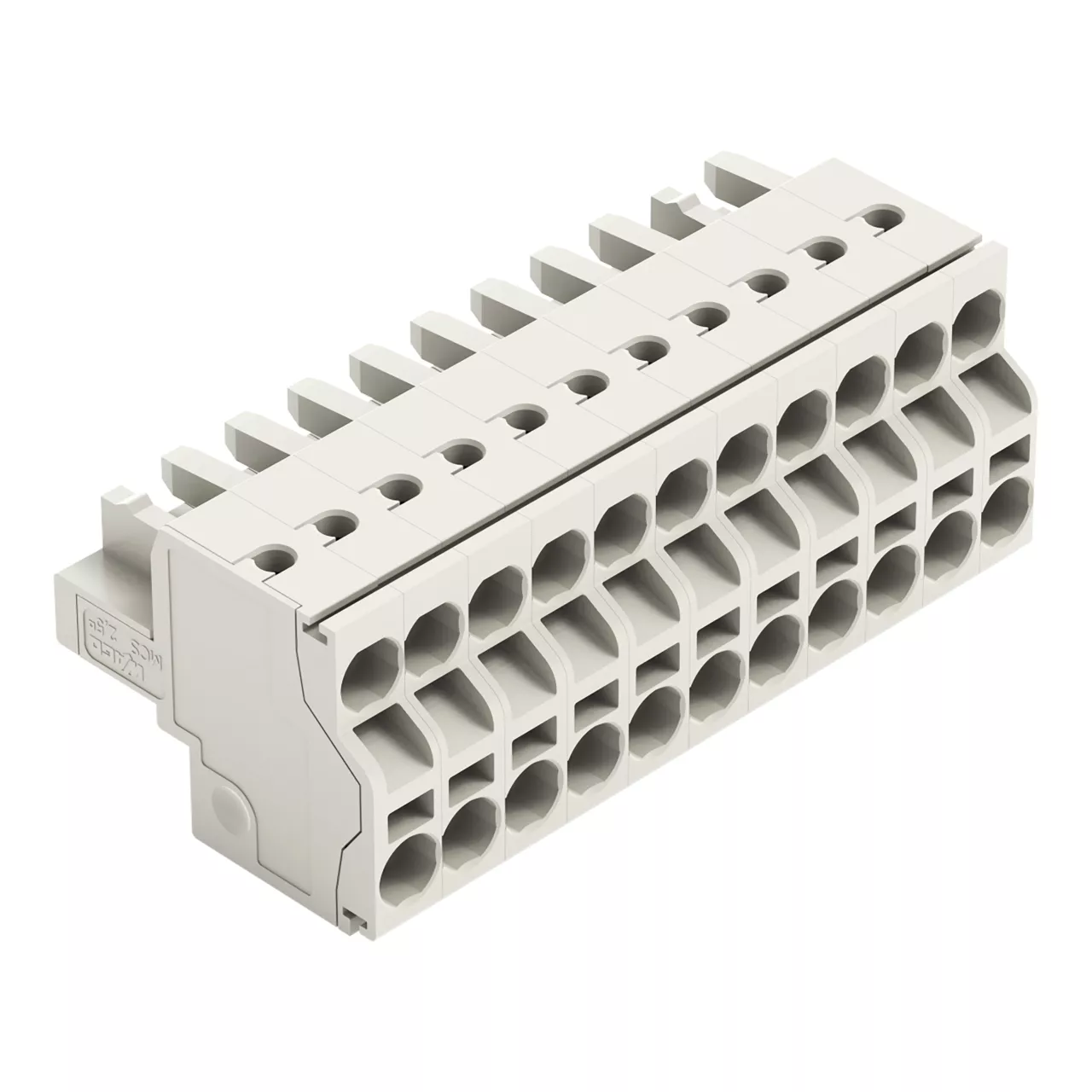 gniazdo 2-przewodowe; Push-in CAGE CLAMP®; 2,5 mm²; raster 5 mm; 11-bieg.; 100% ochrona przed błędnym połączeniem; ze zintegrowaną ścianką końcową; 2,50 mm²; jasnoszary