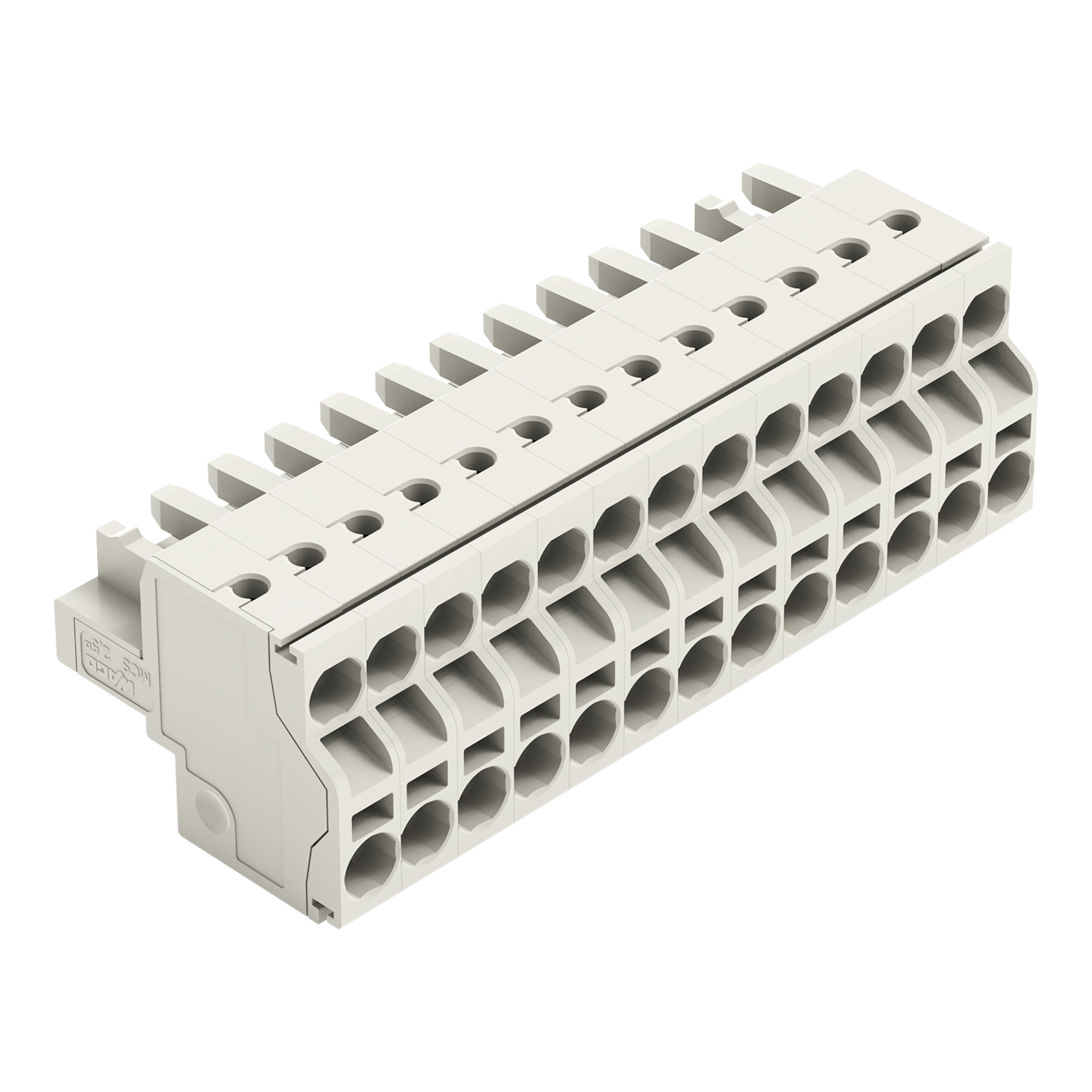 gniazdo 2-przewodowe; Push-in CAGE CLAMP®; 2,5 mm²; raster 5 mm; 13-bieg.; 100% ochrona przed błędnym połączeniem; ze zintegrowaną ścianką końcową; 2,50 mm²; jasnoszary