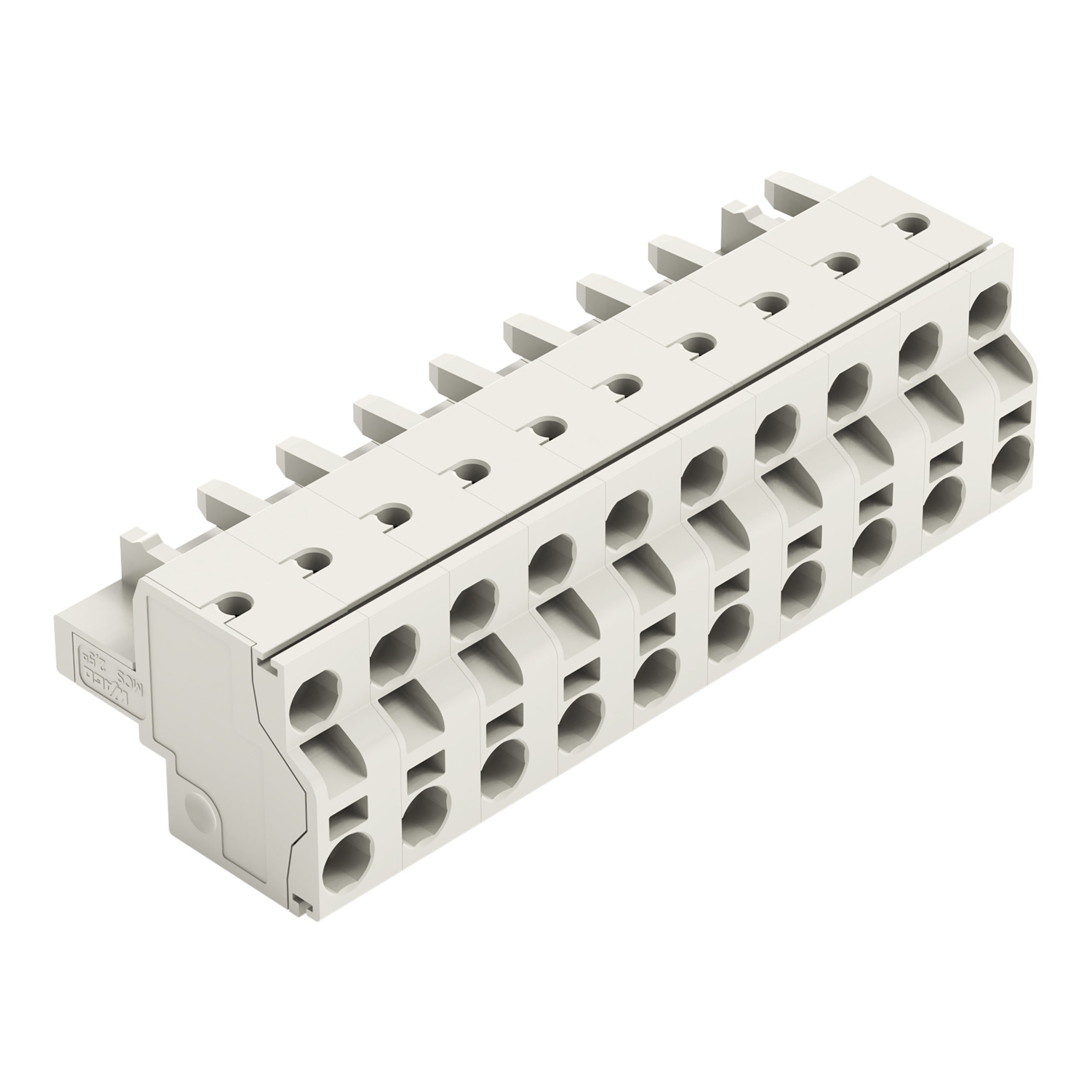 gniazdo 2-przewodowe; Push-in CAGE CLAMP®; 2,5 mm²; raster 7,5 mm; 10-bieg.; 100% ochrona przed błędnym połączeniem; ze zintegrowaną ścianką końcową; 2,50 mm²; jasnoszary