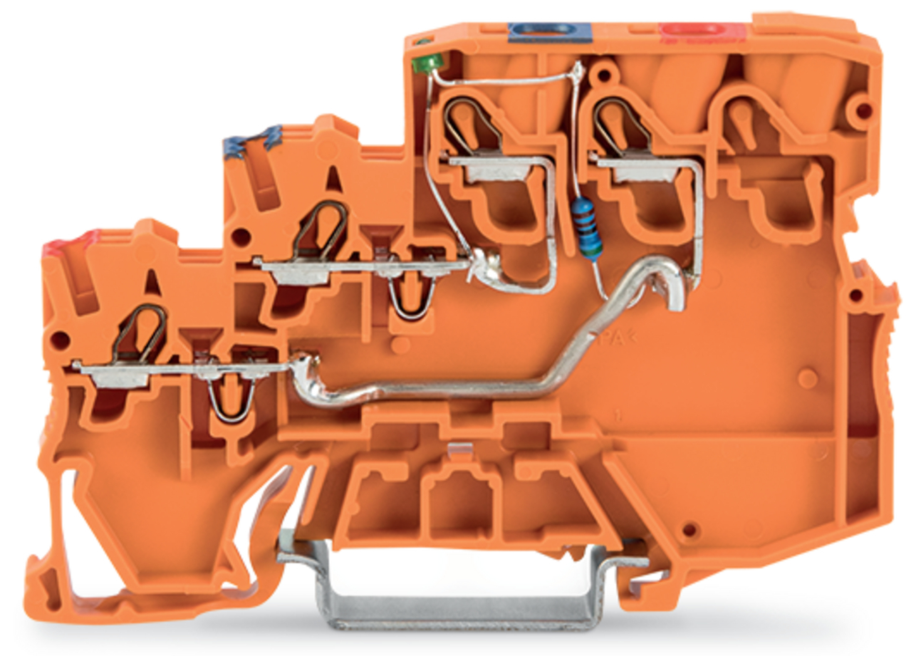 złączka zasilająca sygnałowa 3-piętrowa; LED zielona; zasilanie od strony szafy sterowniczej; 2,5 mm²; Push-in CAGE CLAMP®; 2,50 mm²; pomarańczowy
