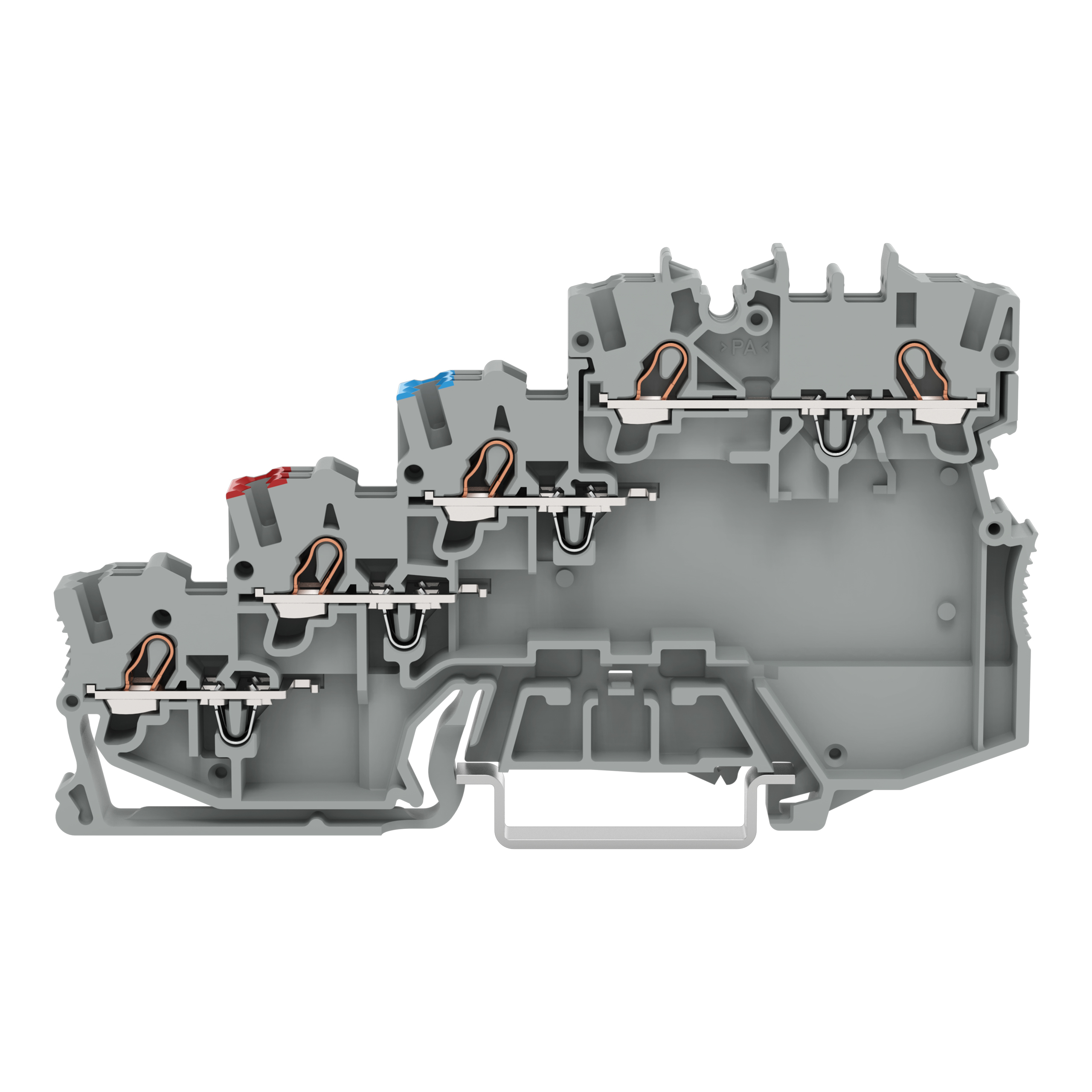 złączka sygnałowa 4-piętrowa; z przyłączem PE, bez stopki PE; z otworami na przew. z kolor. nadrukiem; 1 mm²; Push-in CAGE CLAMP®; 1,00 mm²; szary