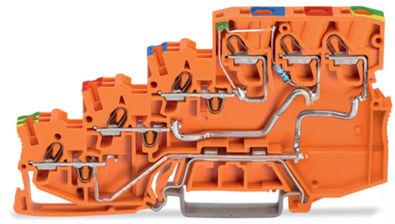 złączka zasilająca sygnałowa 4-piętrowa; LED zielona; zasilanie od strony szafy sterowniczej; z przyłączem PE; 2,5 mm²; Push-in CAGE CLAMP®; 2,50 mm²; pomarańczowy