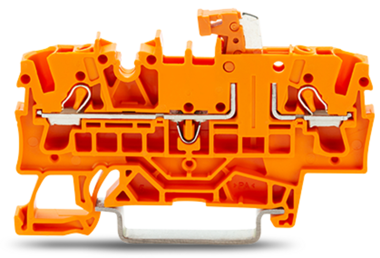 złączka rozłączalno-pomiarowa 2-przewodowa; z możliwością pomiaru; uchwyt łącznika nożowego pomarańczowy; na szynę TS 35 x 15 i 35 x 7,5; 2,5 mm²; Push-in CAGE CLAMP®; 2,50 mm²; pomarańczowy