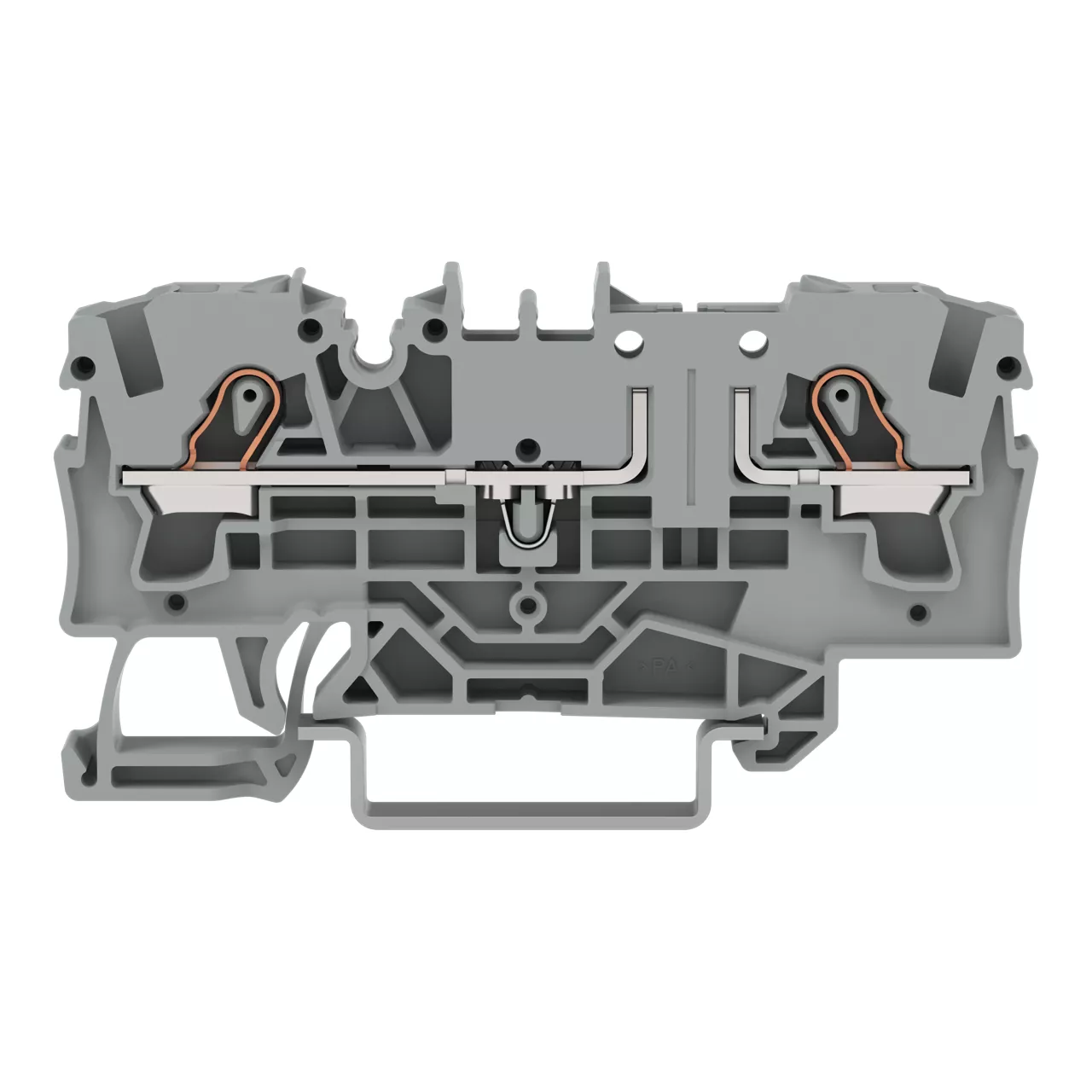 złączka bazowa 2-przewodowa; z otworem pomiarowym; na szynę TS 35 x 15 i 35 x 7,5; 4 mm²; Push-in CAGE CLAMP®; 4,00 mm²; szary