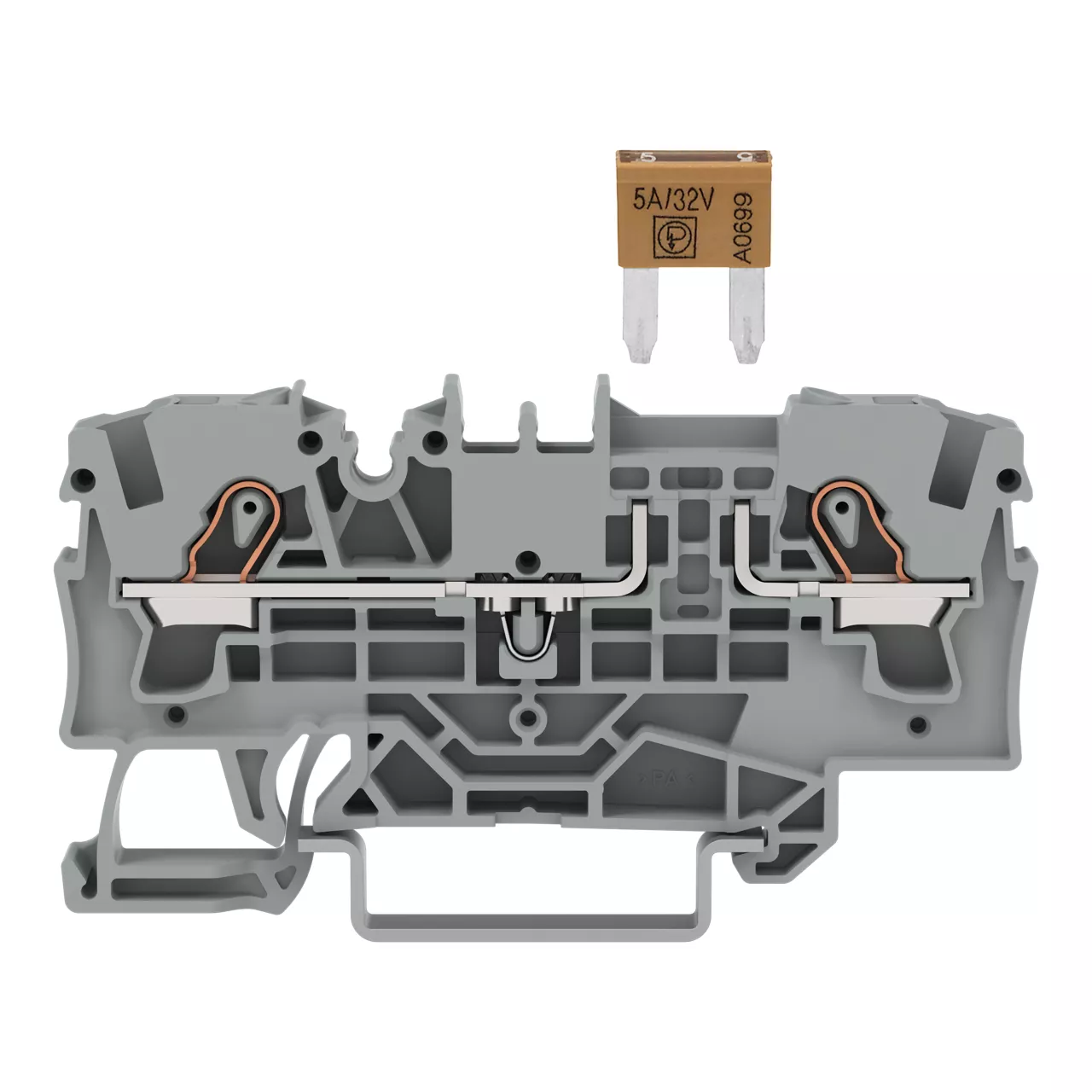 złączka bezpiecznikowa 2-przewodowa; do płaskich bezpieczników samochodowych; z możliwością pomiaru; bez sygnalizacji przepalenia wkładki; na szynę TS 35 x 15 i 35 x 7,5; Push-in CAGE CLAMP®; szary