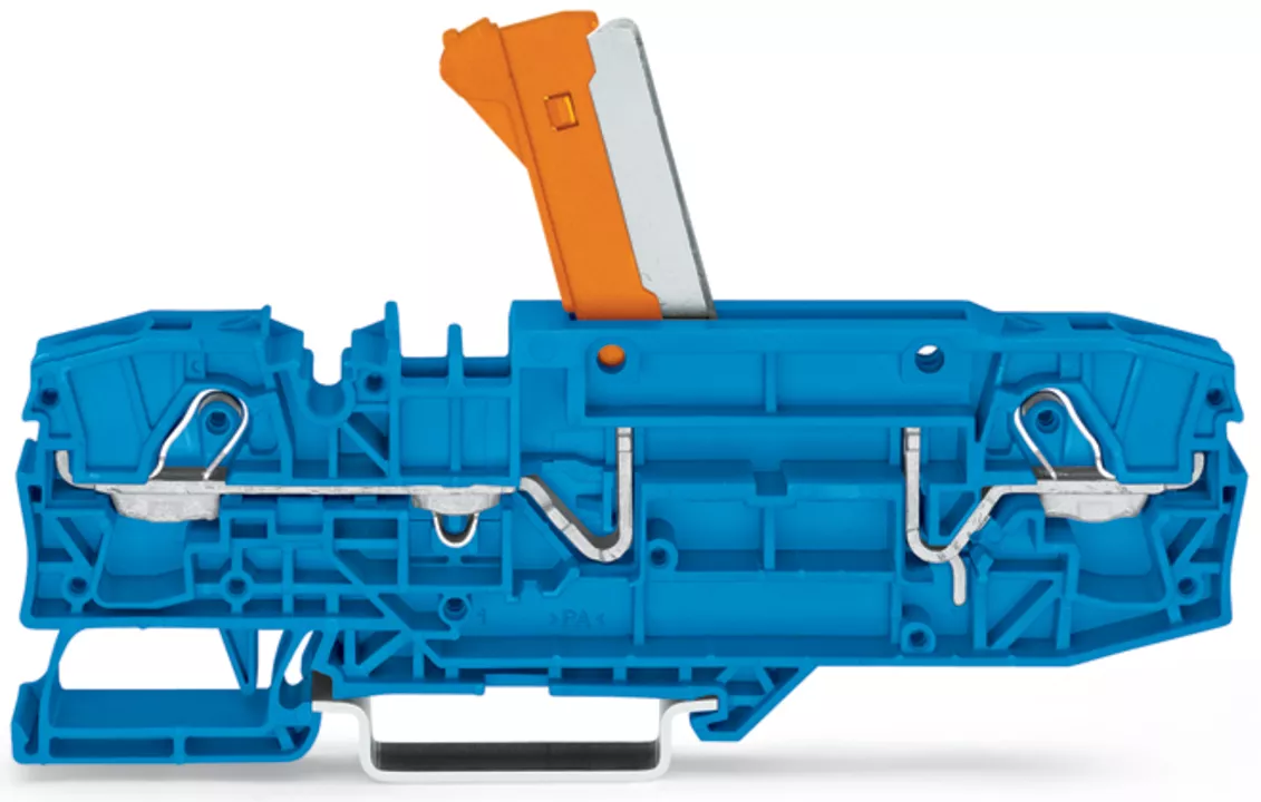 złączka rozłączalno-pomiarowa 2-przewodowa; z uchylnym łącznikiem nożowym; z możliwością pomiaru; uchwyt łącznika nożowego pomarańczowy; na szynę TS 35 x 15 i 35 x 7,5; 6 mm²; Push-in CAGE CLAMP®; 6,00 mm²; niebieski