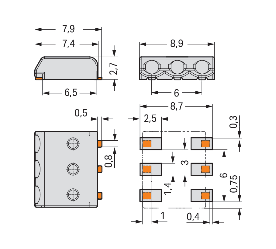 Złączka SMD do płytek drukowanych 0,5 mm² raster 3mm 3-bieg., biała