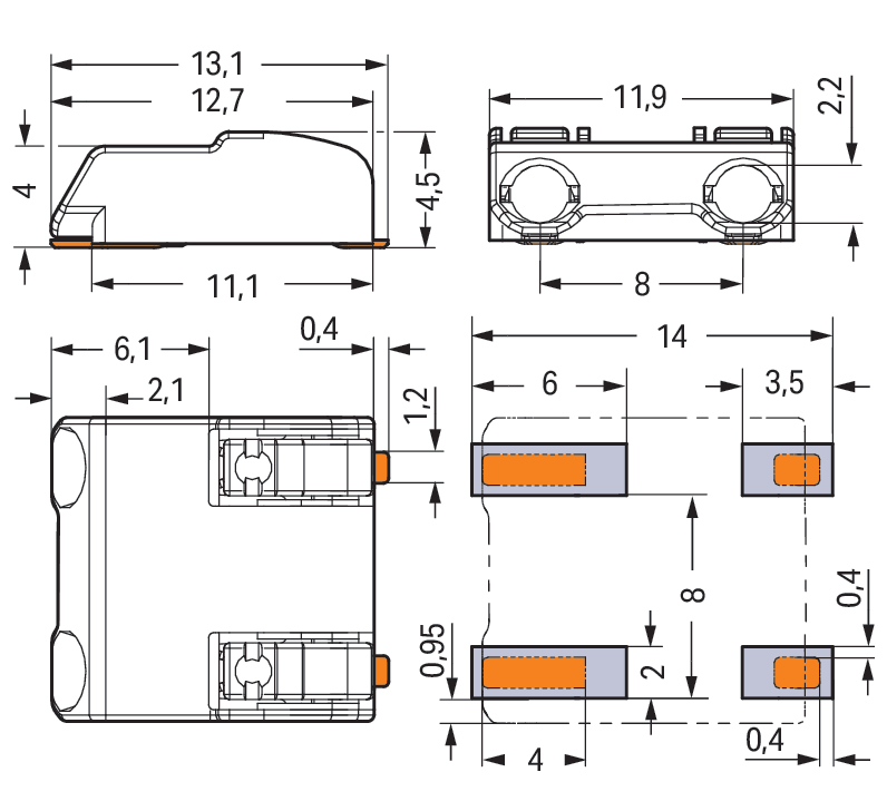Złączka SMD do płytek drukowanych przycisk 0,75 mm² raster 8mm 2-bieg., biała