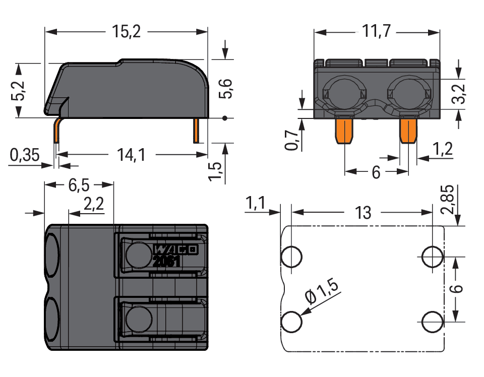 Złącze THR do PCB przycisk 1,5 mm² raster 6 mm 2-bieg., czarny