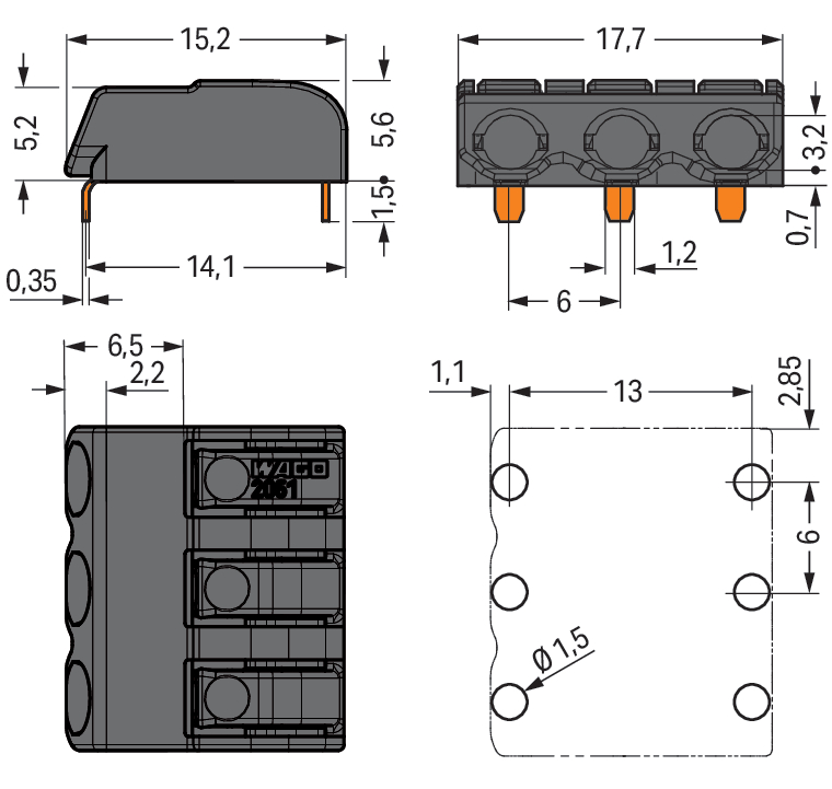 Złącze THR do PCB przycisk 1,5 mm² raster 6 mm 3-bieg., czarny