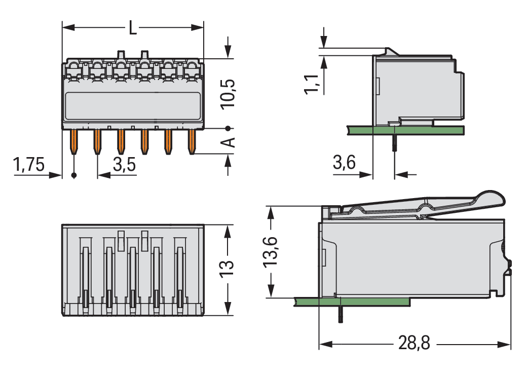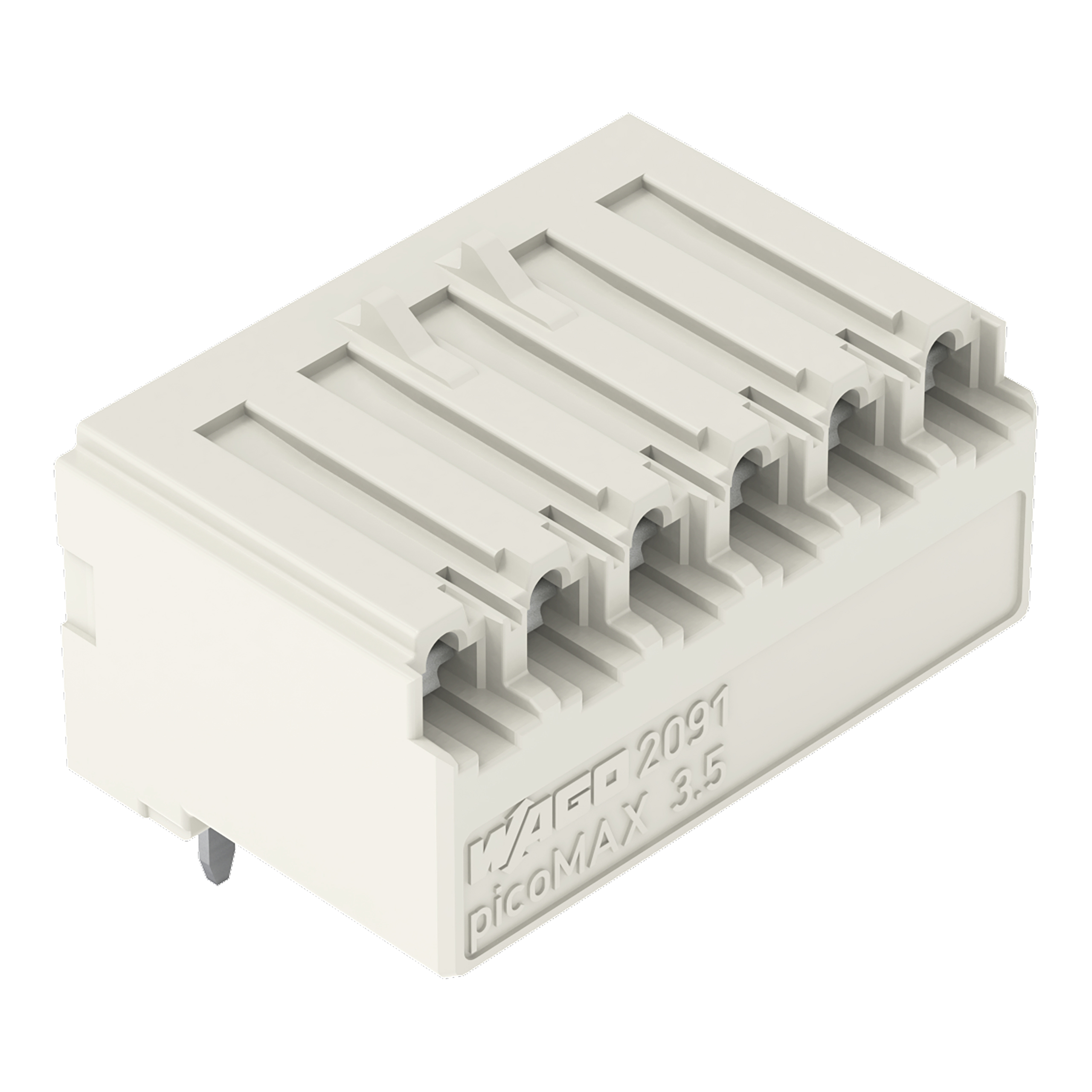 gniazdo THR; konstrukcja kątowa; raster 3,5 mm; 8-bieg.; pin lutowniczy 0,4 x 0,9 mm; jasnoszary