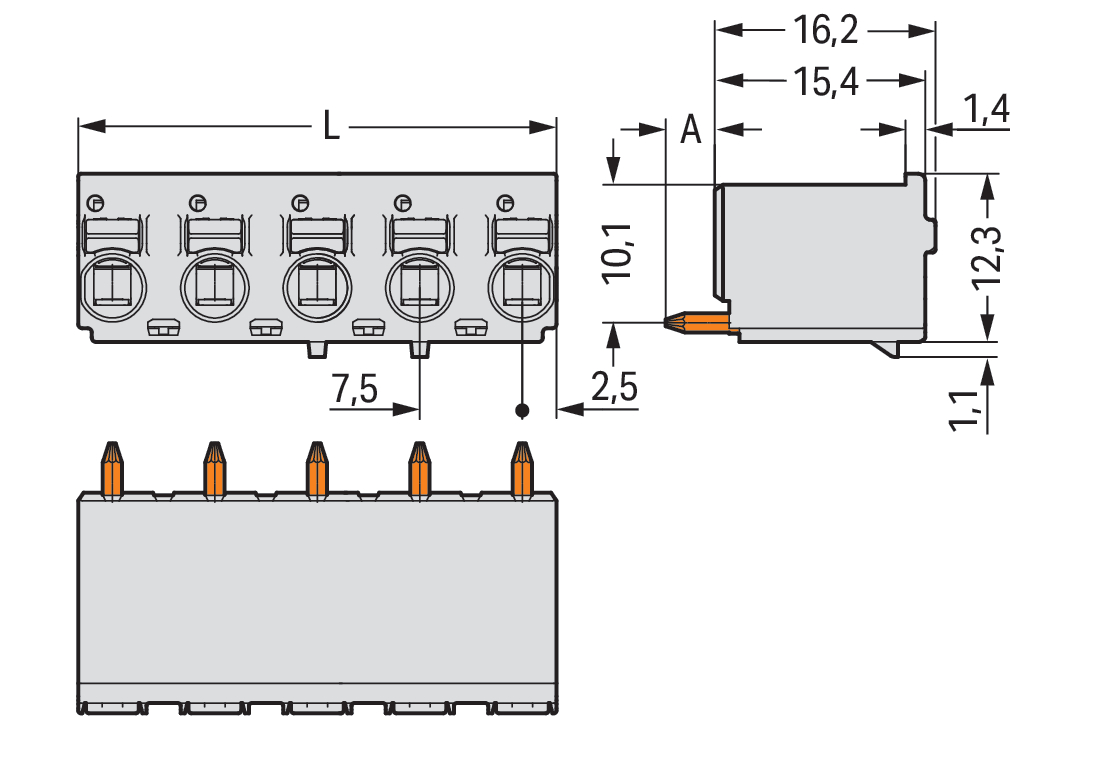 gniazdo THR 1-przewodowe proste; przycisk; Push-in CAGE CLAMP®; 2,5 mm²; raster 7,5 mm; 5-bieg.; pin lutowniczy Ø 1,4 mm; 2,50 mm²; jasnoszary