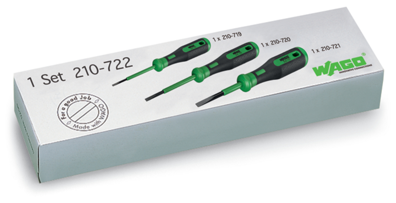 zestaw przyrządów montażowych z częściowo izolowanymi trzpieniami; typ 1 klinga (2,5 x 0,4) mm; typ 2 klinga (3,5 x 0,5) mm; typ 3 klinga (5,5 x 0,8) mm