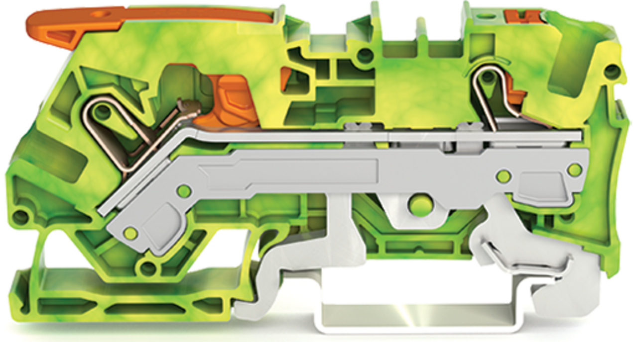 złączka PE 2-przewodowa; z dźwignią i przyciskami; 6 mm²; z otworem pomiarowym; opis z boku i na środku; na szynę TS 35 x 15 i 35 x 7,5; Push-in CAGE CLAMP®; 6,00 mm²; żółto-zielony