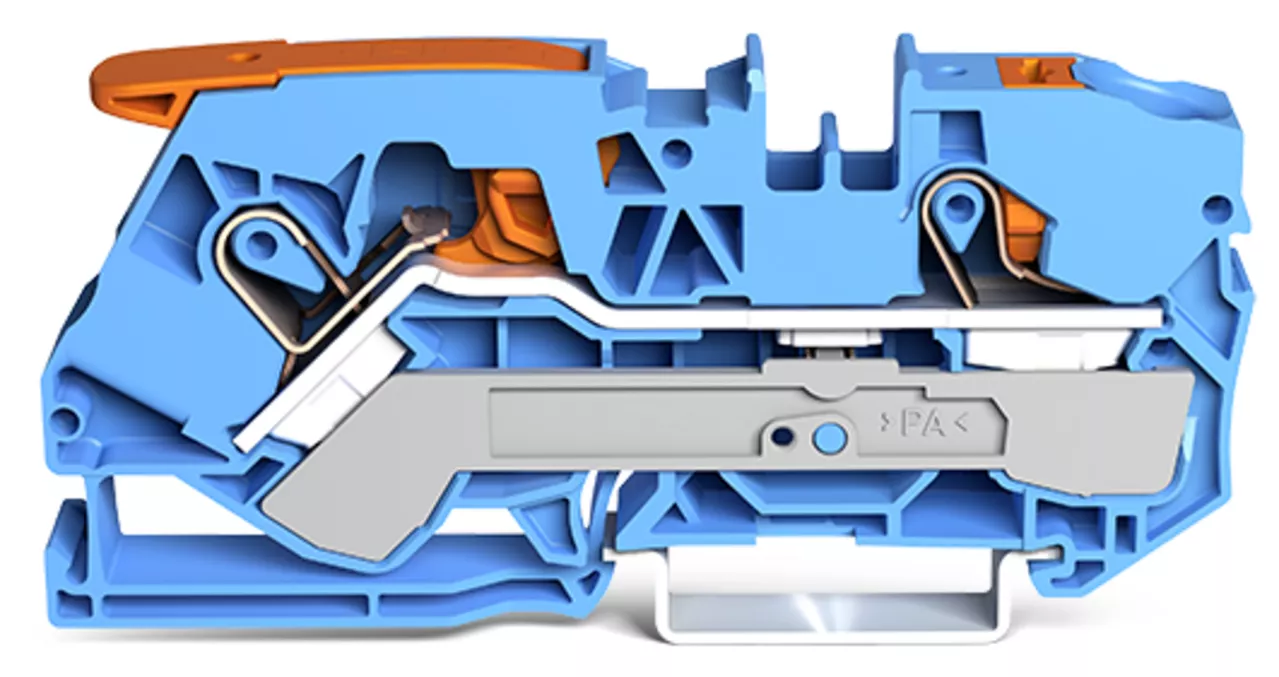 złączka przelotowa 2-przewodowa; z dźwignią i przyciskami; 10 mm²; z otworem pomiarowym; do zastosowań Ex i; opis z boku i na środku; na szynę TS 35 x 15 i 35 x 7,5; Push-in CAGE CLAMP®; 10,00 mm²; niebieski