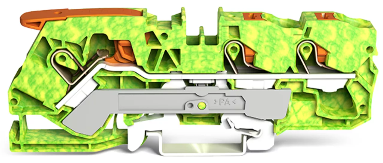 złączka PE 3-przewodowa; z dźwignią i przyciskami; 10 mm²; z otworem pomiarowym; opis z boku i na środku; na szynę TS 35 x 15 i 35 x 7,5; Push-in CAGE CLAMP®; 10,00 mm²; żółto-zielony