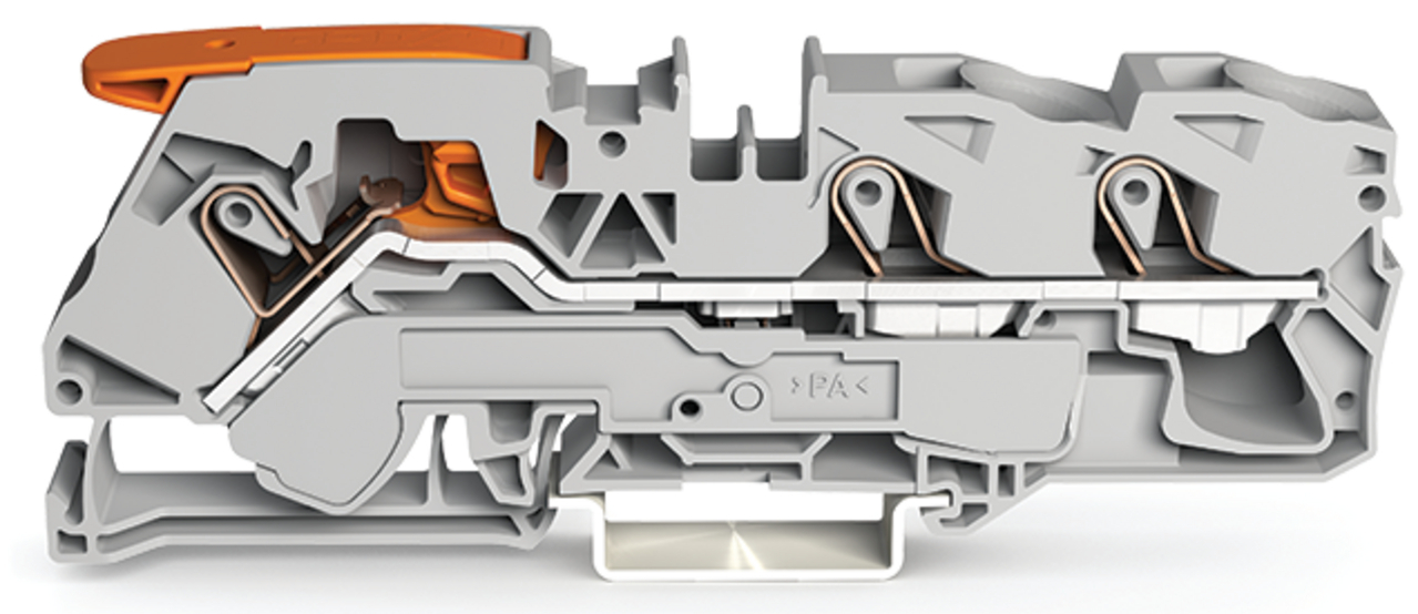 złączka przelotowa 3-przewodowa; z dźwignią i Push-in CAGE CLAMP®; 16 mm²; z otworem pomiarowym; opis z boku i na środku; na szynę TS 35 x 15 i 35 x 7,5; Push-in CAGE CLAMP®; 16,00 mm²; szary