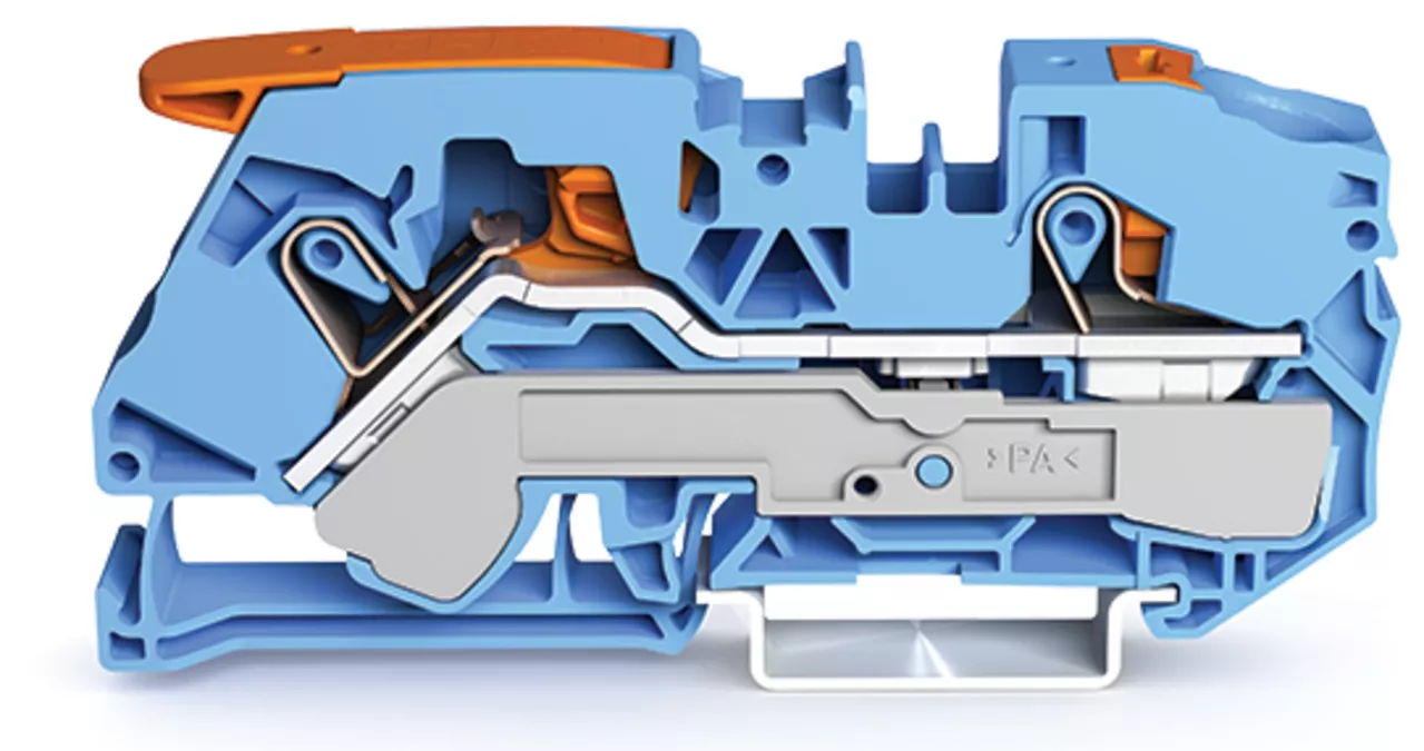 złączka przelotowa 2-przewodowa; z dźwignią i przyciskami; 16 mm²; z otworem pomiarowym; do zastosowań Ex i; opis z boku i na środku; na szynę TS 35 x 15 i 35 x 7,5; Push-in CAGE CLAMP®; 16,00 mm²; niebieski