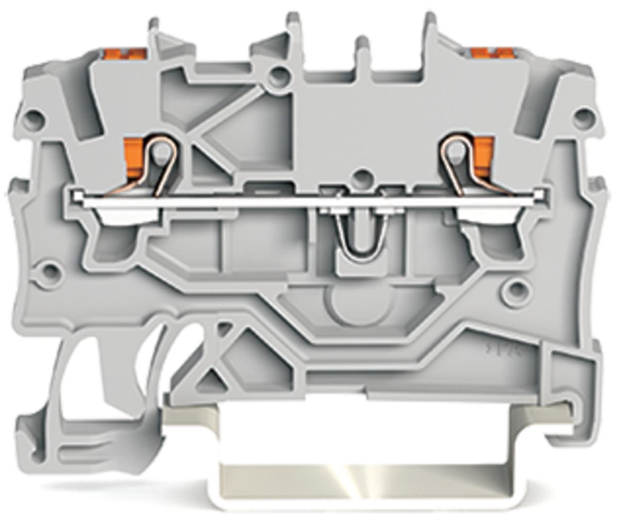 złączka przelotowa 2-przewodowa; z przyciskami; 1 mm²; z otworem pomiarowym; opis z boku i na środku; na szynę TS 35 x 15 i 35 x 7,5; Push-in CAGE CLAMP®; 1,00 mm²; szary