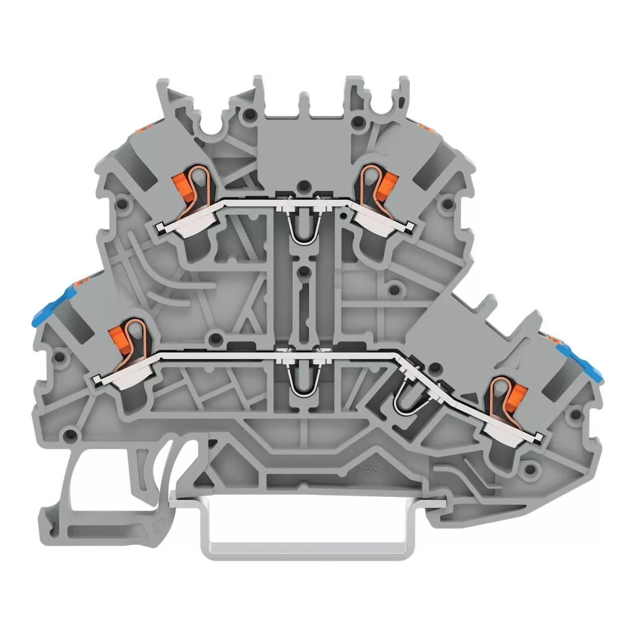 złączka 2-piętrowa; z przyciskami; złączka przelotowa/przelotowa; N/L; bez podstawki oznacznika; otwory na przewody, parter, nadruk nieb.; na szynę TS 35 x 15 i 35 x 7,5; 1 mm²; Push-in CAGE CLAMP®; 1,00 mm²; szary