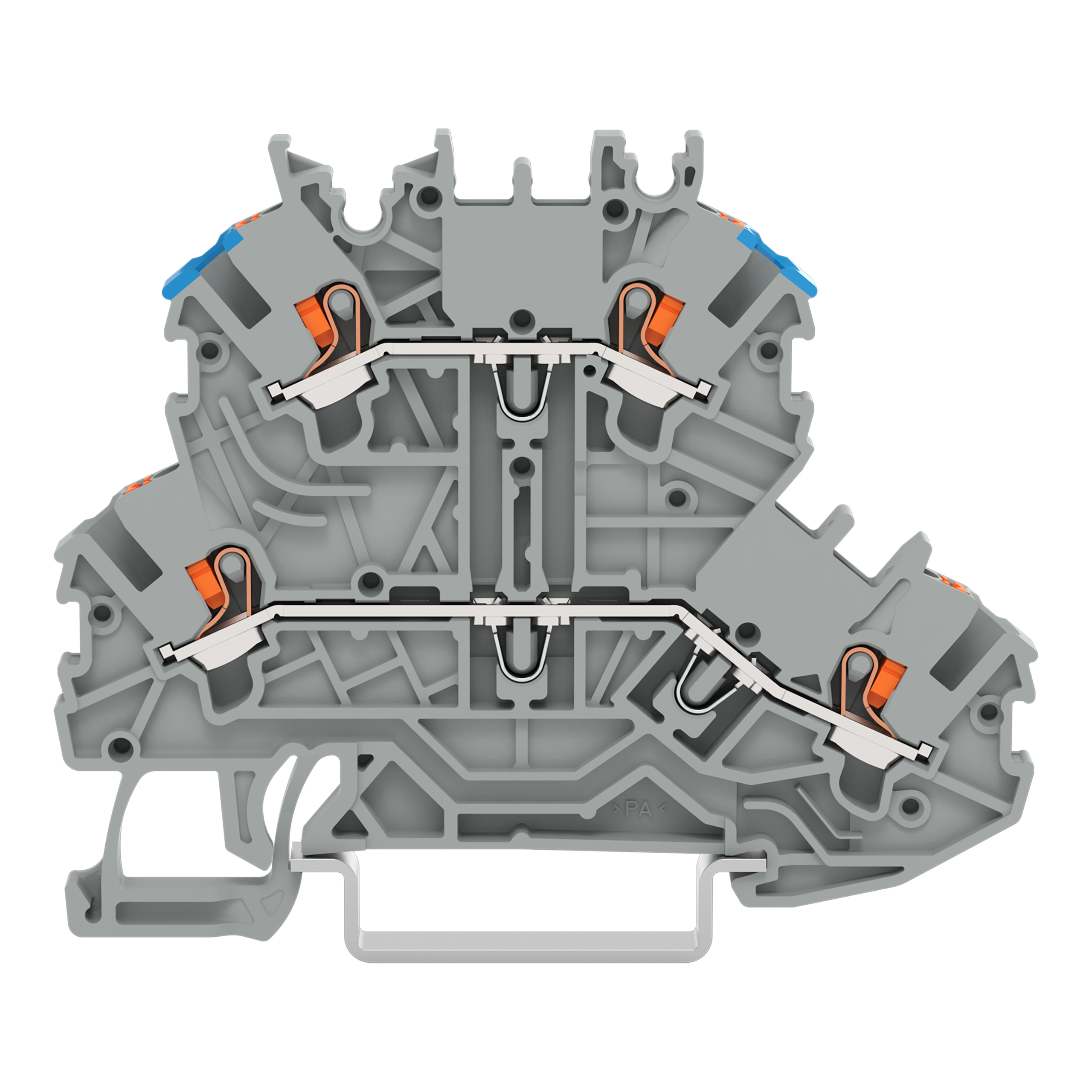 złączka 2-piętrowa; z przyciskami; złączka przelotowa/przelotowa; L/N; bez podstawki oznacznika; otwory na przewody piętro, nadruk nieb.; na szynę TS 35 x 15 i 35 x 7,5; 1 mm²; Push-in CAGE CLAMP®; 1,00 mm²; szary