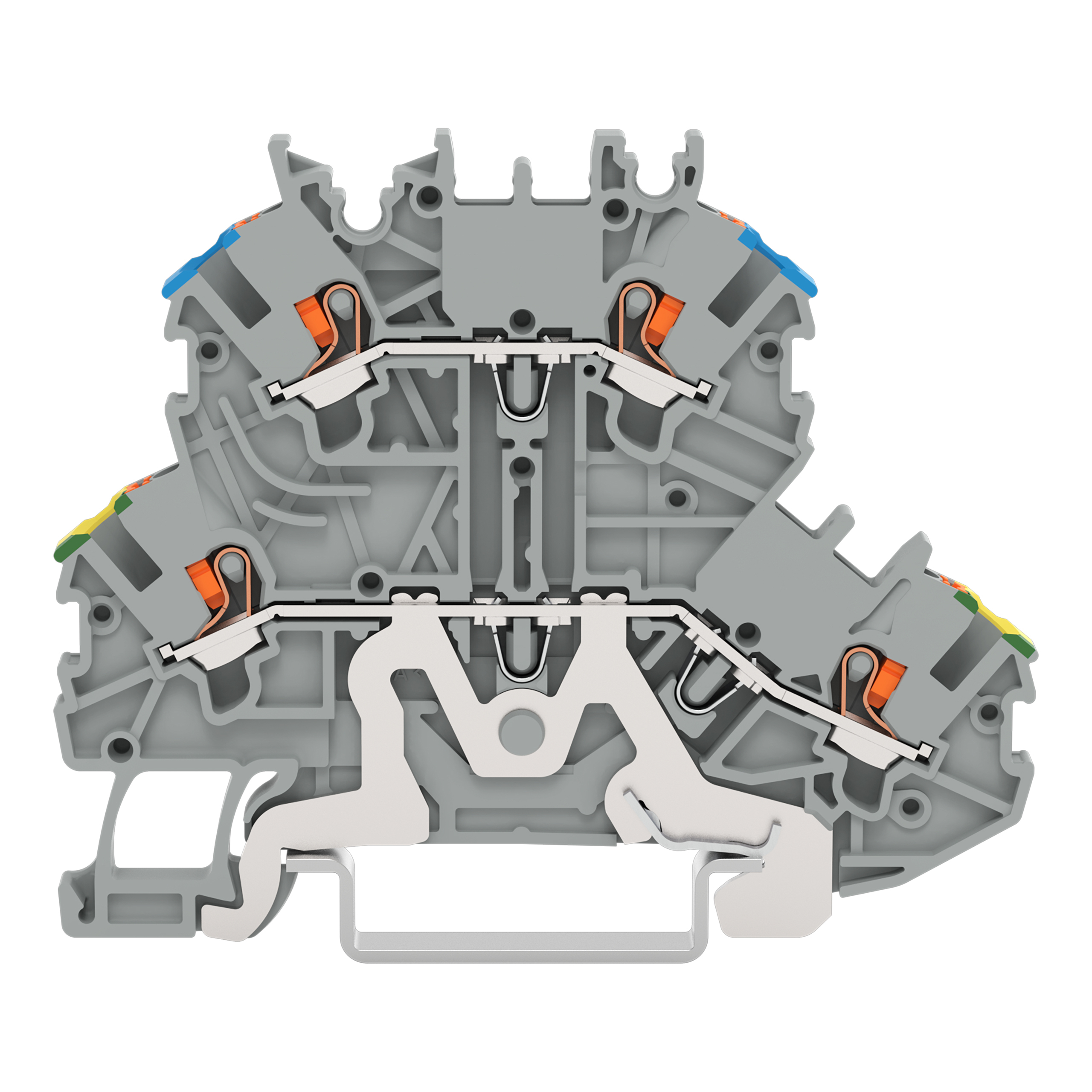 złączka 2-piętrowa; złączka PE/przelotowa; z przyciskami; 1 mm²; PE/N; bez podstawki oznacznika; otwory na przewody piętro, nadruk nieb.; na szynę TS 35 x 15 i 35 x 7,5; Push-in CAGE CLAMP®; 1,00 mm²; szary