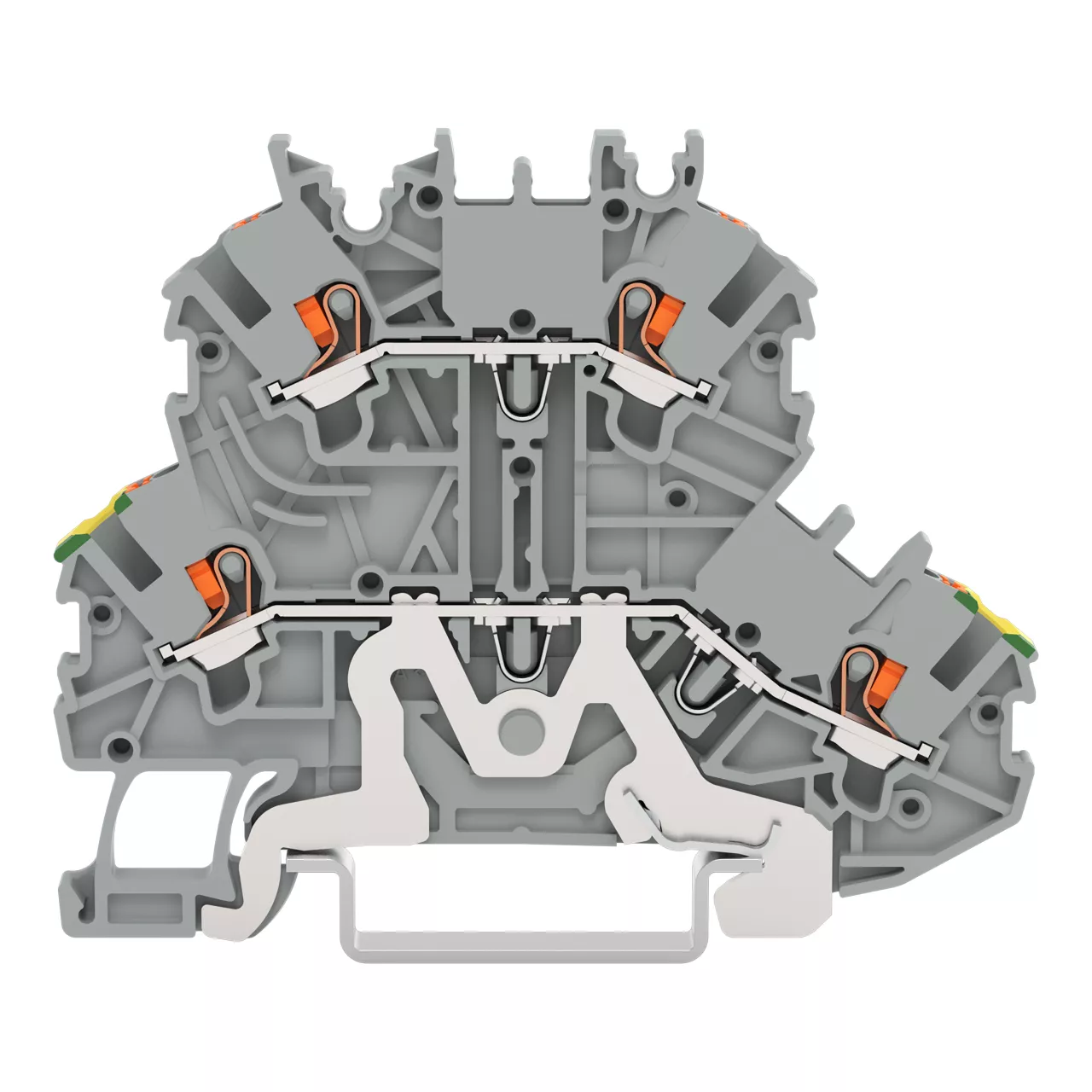 złączka 2-piętrowa; złączka PE/przelotowa; z przyciskami; 1 mm²; PE/L; bez podstawki oznacznika; otwór na przew. żółto-zielony nadruk; na szynę TS 35 x 15 i 35 x 7,5; Push-in CAGE CLAMP®; 1,00 mm²; szary