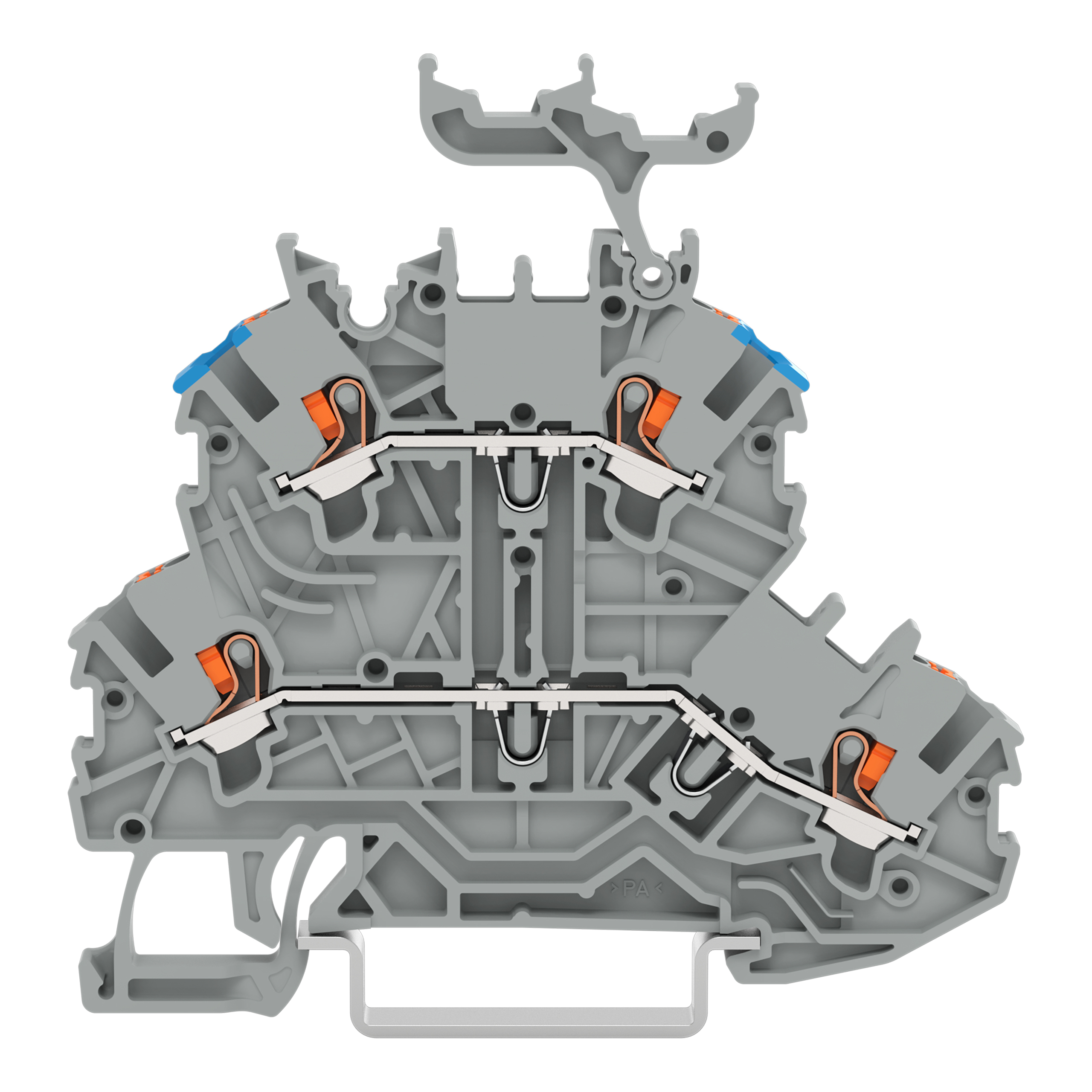 złączka 2-piętrowa; z przyciskami; złączka przelotowa/przelotowa; L/N; z podstawką oznacznika; otwory na przewody piętro, nadruk nieb.; na szynę TS 35 x 15 i 35 x 7,5; 1 mm²; Push-in CAGE CLAMP®; 1,00 mm²; szary