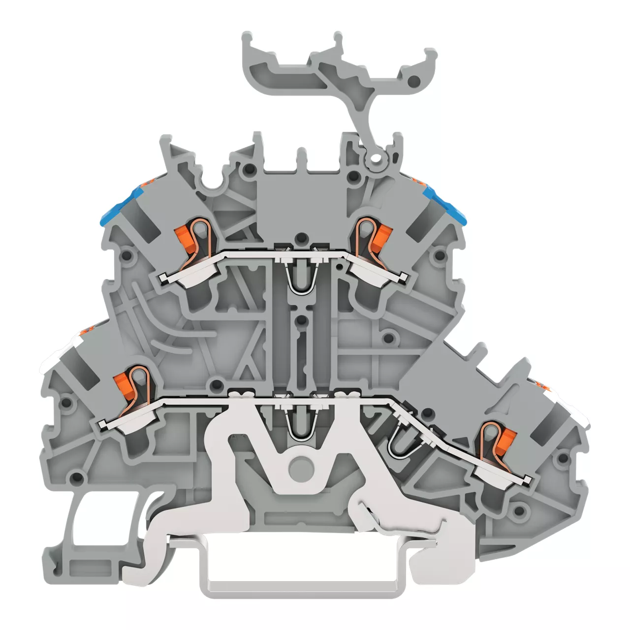 złączka 2-piętrowa; złączka do ekranu/przelotowa; z przyciskami; 1 mm²; ekranowanie/N; z podstawką oznacznika; otwory na przewody piętro, nadruk nieb.; na szynę TS 35 x 15 i 35 x 7,5; Push-in CAGE CLAMP®; 1,00 mm²; szary