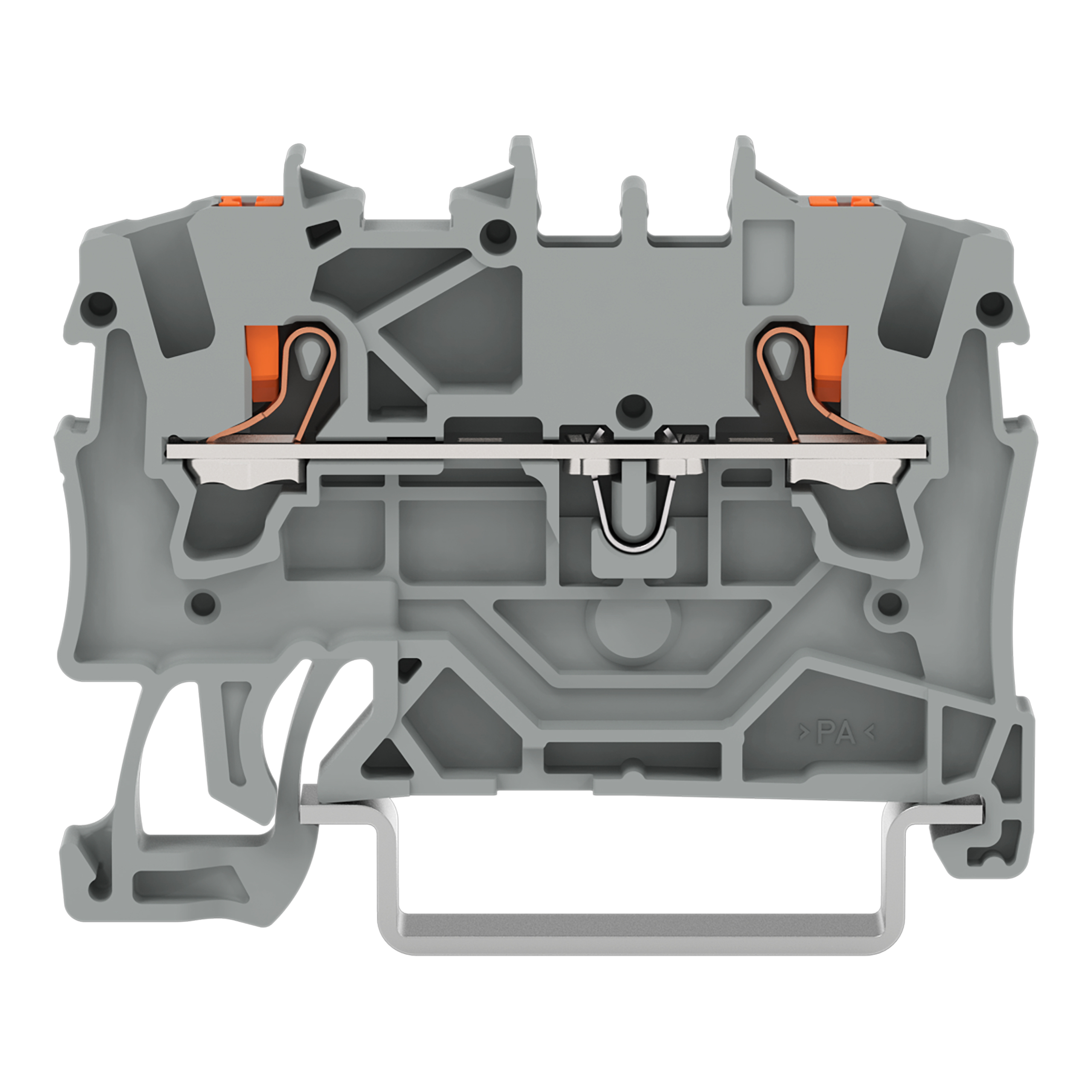 złączka przelotowa 2-przewodowa; z przyciskami; 1,5 mm²; z otworem pomiarowym; opis z boku i na środku; na szynę TS 35 x 15 i 35 x 7,5; Push-in CAGE CLAMP®; 1,50 mm²; szary