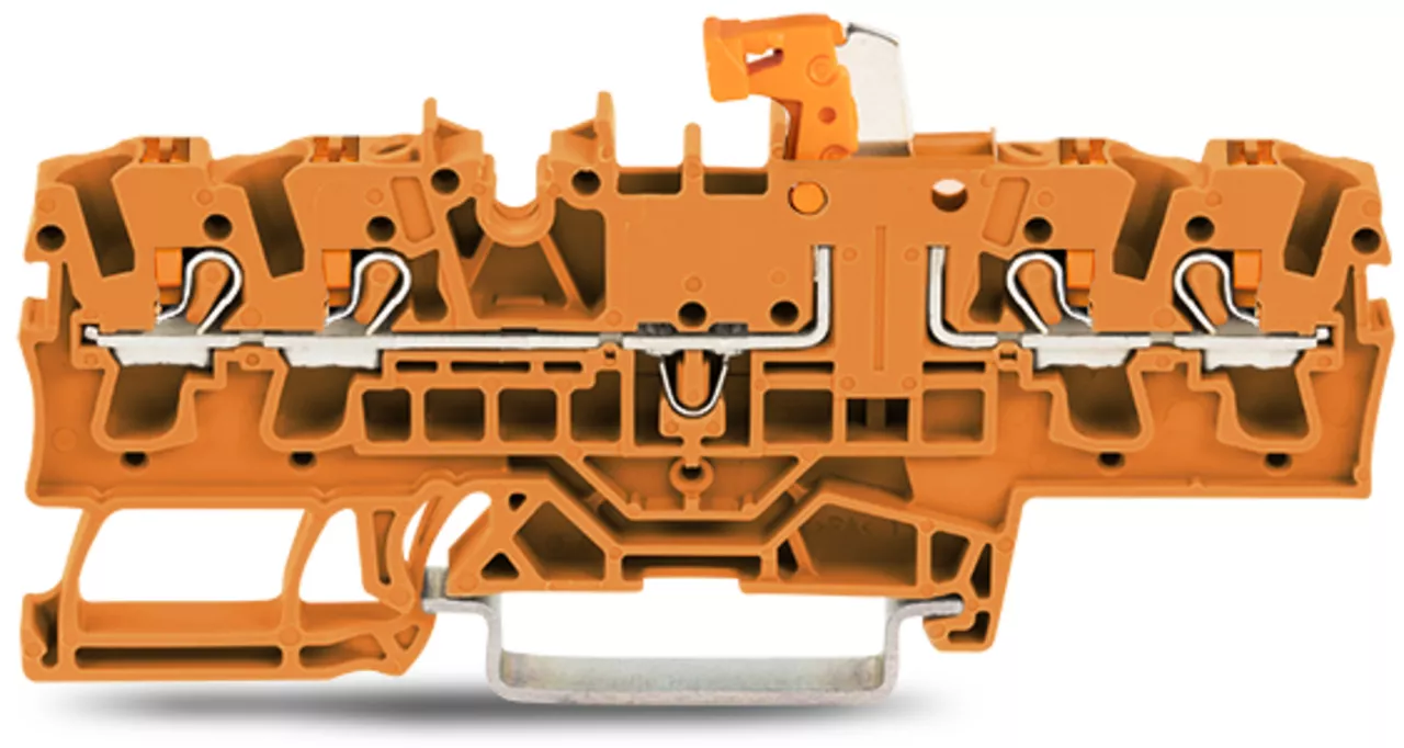 złączka rozłączalno-pomiarowa 4-przewodowa; z przyciskami; z możliwością pomiaru; uchwyt łącznika nożowego pomarańczowy; na szynę TS 35 x 15 i 35 x 7,5; 2,5 mm²; Push-in CAGE CLAMP®; 2,50 mm²; pomarańczowy