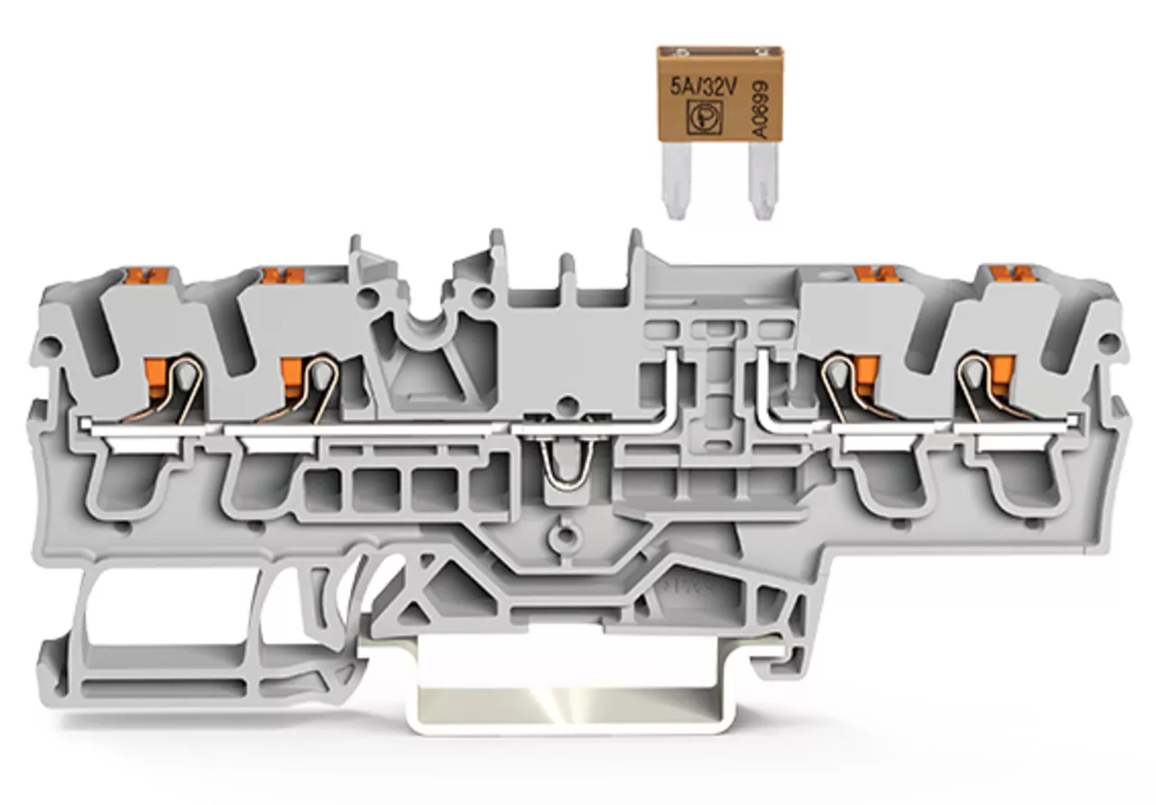 złączka bezpiecznikowa 4-przewodowa; do pł. bezpiecz. samochod. Mini; zgodnie z DIN 7258-3f, ISO 8820-3; z możliwością pomiaru; z przyciskami; bez sygnalizacji przepalenia wkładki; 2,5 mm²; Push-in CAGE CLAMP®; szary