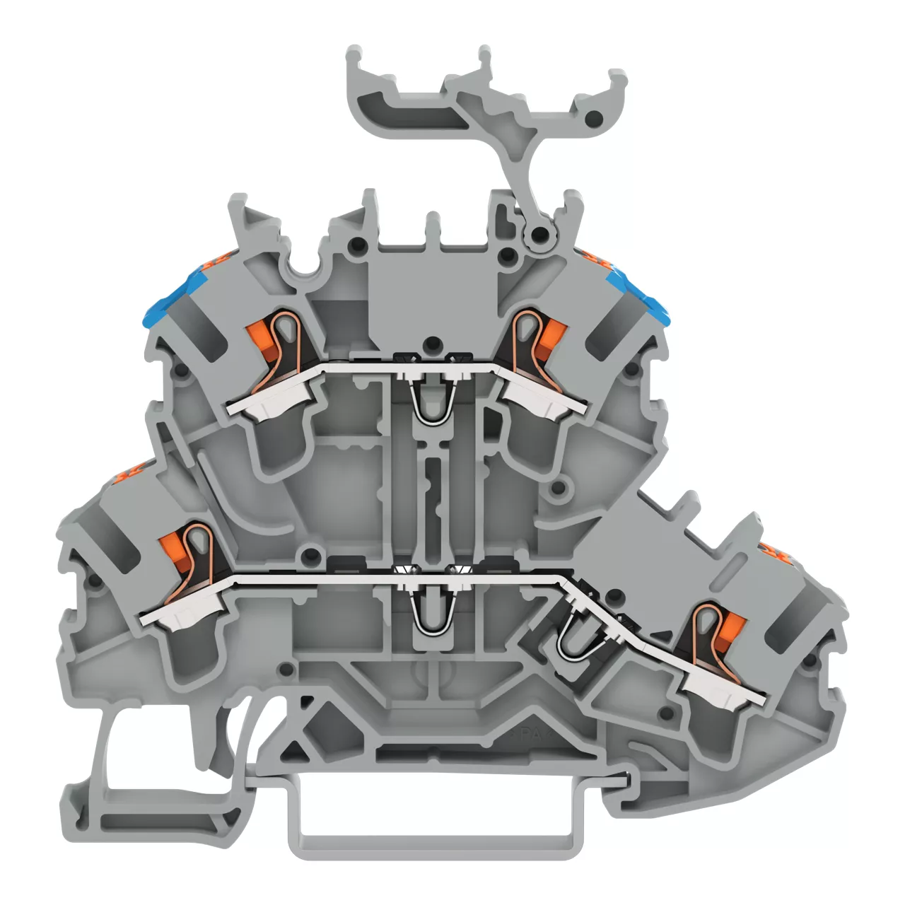 złączka 2-piętrowa; z przyciskami; złączka przelotowa/przelotowa; L/N; z podstawką oznacznika; do zastosowań Ex e II; otwory na przewody piętro, nadruk nieb.; na szynę TS 35 x 15 i 35 x 7,5; 2,5 mm²; Push-in CAGE CLAMP®; 2,50 mm²; szary