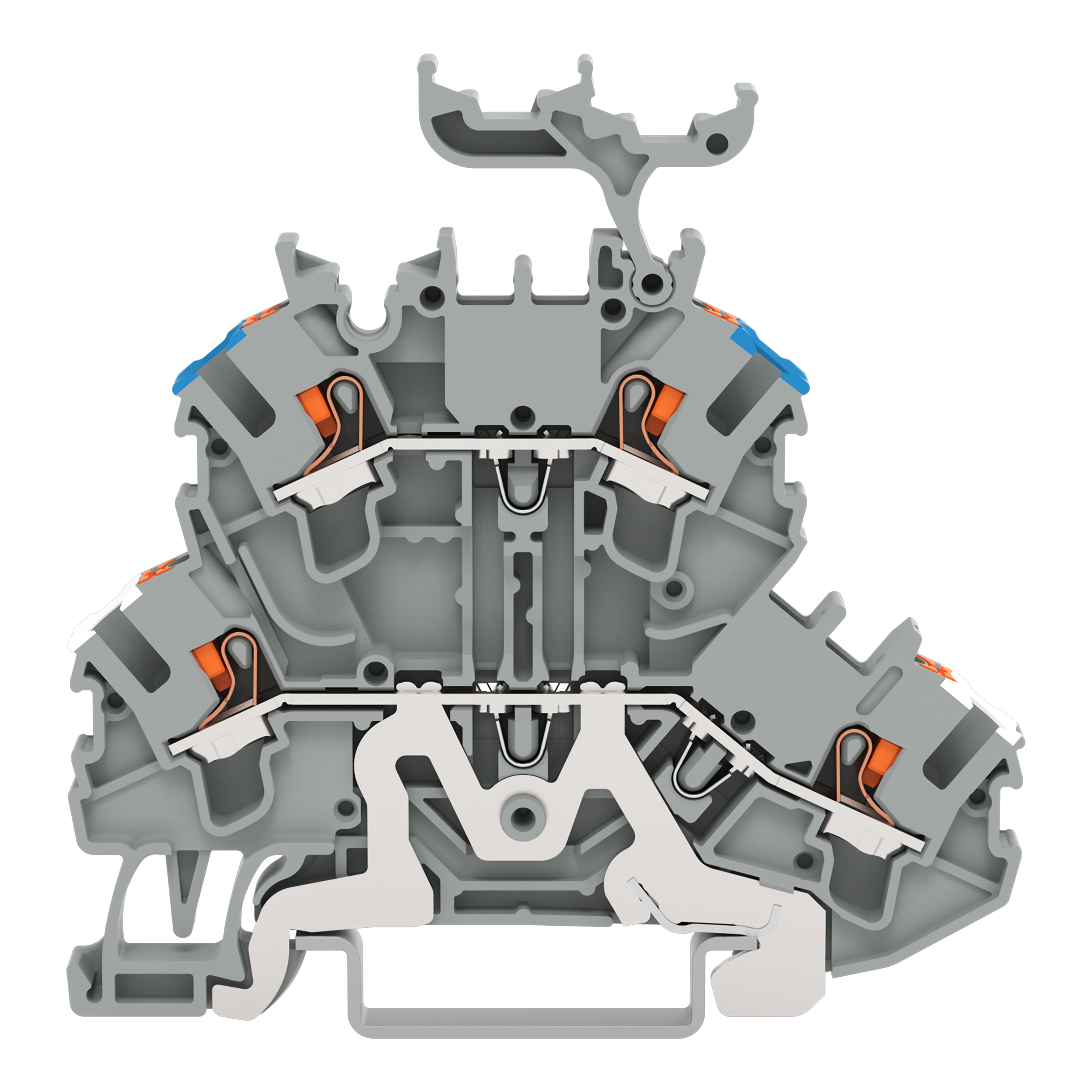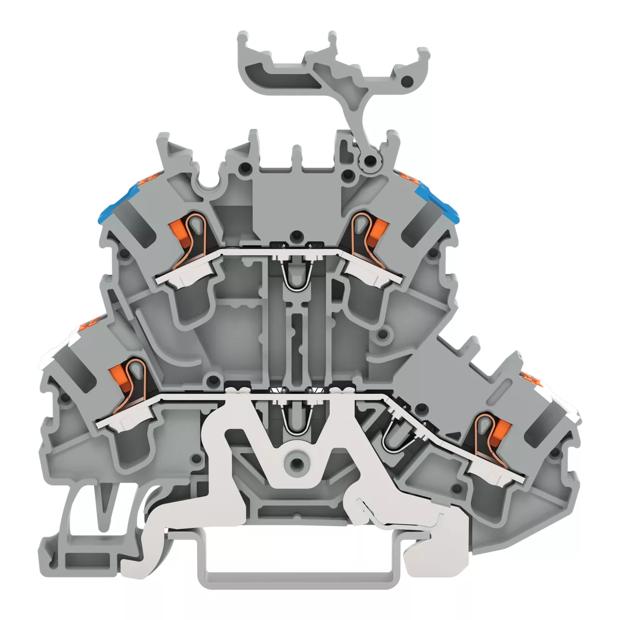złączka 2-piętrowa; złączka do ekranu/przelotowa; z przyciskami; 2,5 mm²; ekranowanie/N; z podstawką oznacznika; otwory na przewody piętro, nadruk nieb.; na szynę TS 35 x 15 i 35 x 7,5; Push-in CAGE CLAMP®; 2,50 mm²; szary