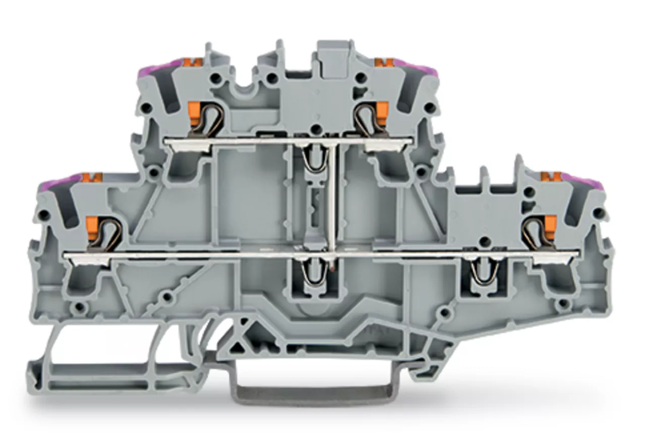 złączka 2-piętrowa; z przyciskami; złączka przelotowa 4-przewodowa; L; bez podstawki oznacznika; do zastosowań Ex e II; z mostkowaniem wewnętrznym; otwory na przewody z fiolet. nadrukiem; na szynę TS 35 x 15 i 35 x 7,5; 2,5 mm²; Push-in CAGE CLAMP®; 2,50 mm²; szary